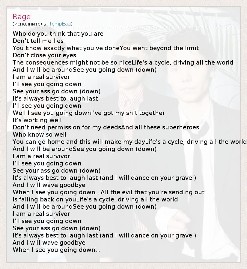 Who do you think that you are Don't tell me lies You know exactly what you've doneYou went beyond the limit Don't close your eyes The consequences might not be so niceLife's a cycle, driving all the world And I will be aroundSee you going down (down) I am a real survivor I'll see you going down See your ass go down (down) It's always best to laugh last I'll see you going down Well I see you going downI've got my shit together It's working well Don't need permission for my deedsAnd all these superheroes Who know so well You can go home and this will make my dayLife's a cycle, driving all the world And I will be aroundSee you going down (down) I am a real survivor I'll see you going down See your ass go down (down) It's always best to laugh last (and I will dance on your grave ) And I will wave goodbye When I see you going down...All the evil that you're sending out Is falling back on youLife's a cycle, driving all the world And I will be aroundSee you going down (down) I am a real survivor I'll see you going down See your ass go down (down) It's always best to laugh last (and I will dance on your grave ) And I will wave goodbye When I see you going down...