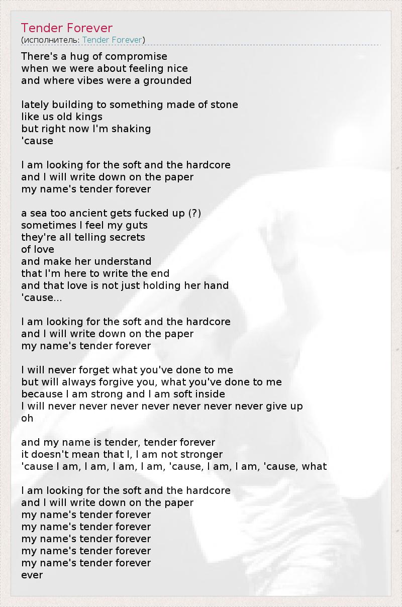 There's a hug of compromise when we were about feeling nice and where vibes were a grounded lately building to something made of stone like us old kings but right now I'm shaking 'cause I am looking for the soft and the hardcore and I will write down on the paper my name's tender forever a sea too ancient gets fucked up (?) sometimes I feel my guts they're all telling secrets of love and make her understand that I'm here to write the end and that love is not just holding her hand 'cause... I am looking for the soft and the hardcore and I will write down on the paper my name's tender forever I will never forget what you've done to me but will always forgive you, what you've done to me because I am strong and I am soft inside I will never never never never never never never give up oh and my name is tender, tender forever it doesn't mean that I, I am not stronger 'cause I am, I am, I am, I am, 'cause, I am, I am, 'cause, what I am looking for the soft and the hardcore and I will write down on the paper my name's tender forever my name's tender forever my name's tender forever my name's tender forever my name's tender forever ever