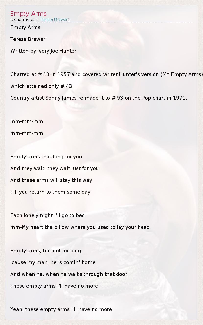 Empty Arms Teresa Brewer Written by Ivory Joe Hunter Charted at # 13 in 1957 and covered writer Hunter's version (MY Empty Arms) which attained only # 43 Country artist Sonny James re-made it to # 93 on the Pop chart in 1971. mm-mm-mm mm-mm-mm Empty arms that long for you And they wait, they wait just for you And these arms will stay this way Till you return to them some day Each lonely night I'll go to bed mm-My heart the pillow where you used to lay your head Empty arms, but not for long 'cause my man, he is comin' home And when he, when he walks through that door These empty arms I'll have no more Yeah, these empty arms I'll have no more