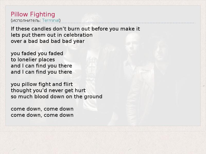 If these candles don't burn out before you make it lets put them out in celebration over a bad bad bad bad year you faded you faded to lonelier places and I can find you there and I can find you there you pillow fight and flirt thought you'd never get hurt so much blood down on the ground come down, come down come down, come down