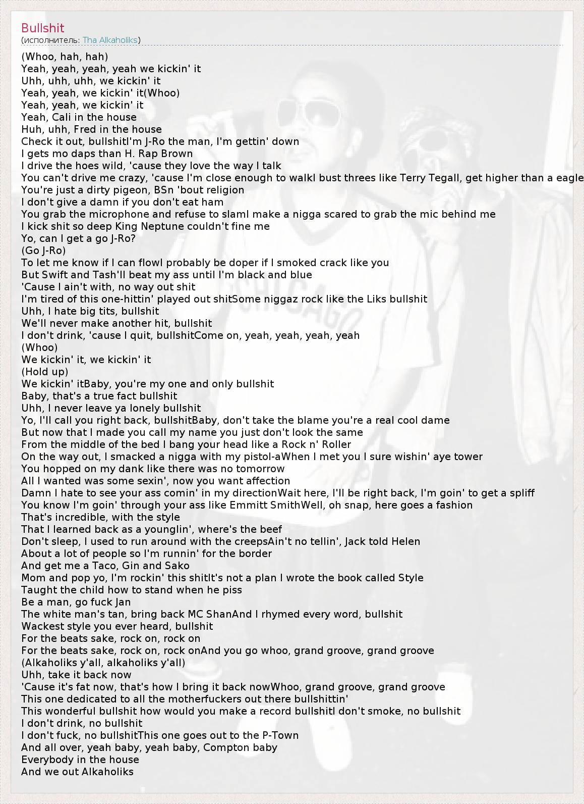 (Whoo, hah, hah) Yeah, yeah, yeah, yeah we kickin' it Uhh, uhh, uhh, we kickin' it Yeah, yeah, we kickin' it(Whoo) Yeah, yeah, we kickin' it Yeah, Cali in the house Huh, uhh, Fred in the house Check it out, bullshitI'm J-Ro the man, I'm gettin' down I gets mo daps than H. Rap Brown I drive the hoes wild, 'cause they love the way I talk You can't drive me crazy, 'cause I'm close enough to walkI bust threes like Terry Tegall, get higher than a eagle You're just a dirty pigeon, BSn 'bout religion I don't give a damn if you don't eat ham You grab the microphone and refuse to slamI make a nigga scared to grab the mic behind me I kick shit so deep King Neptune couldn't fine me Yo, can I get a go J-Ro? (Go J-Ro) To let me know if I can flowI probably be doper if I smoked crack like you But Swift and Tash'll beat my ass until I'm black and blue 'Cause I ain't with, no way out shit I'm tired of this one-hittin' played out shitSome niggaz rock like the Liks bullshit Uhh, I hate big tits, bullshit We'll never make another hit, bullshit I don't drink, 'cause I quit, bullshitCome on, yeah, yeah, yeah, yeah (Whoo) We kickin' it, we kickin' it (Hold up) We kickin' itBaby, you're my one and only bullshit Baby, that's a true fact bullshit Uhh, I never leave ya lonely bullshit Yo, I'll call you right back, bullshitBaby, don't take the blame you're a real cool dame But now that I made you call my name you just don't look the same From the middle of the bed I bang your head like a Rock n' Roller On the way out, I smacked a nigga with my pistol-aWhen I met you I sure wishin' aye tower You hopped on my dank like there was no tomorrow All I wanted was some sexin', now you want affection Damn I hate to see your ass comin' in my directionWait here, I'll be right back, I'm goin' to get a spliff You know I'm goin' through your ass like Emmitt SmithWell, oh snap, here goes a fashion That's incredible, with the style That I learned back as a younglin', where's the beef Don't sleep, I used to run around with the creepsAin't no tellin', Jack told Helen About a lot of people so I'm runnin' for the border And get me a Taco, Gin and Sako Mom and pop yo, I'm rockin' this shitIt's not a plan I wrote the book called Style Taught the child how to stand when he piss Be a man, go fuck Jan The white man's tan, bring back MC ShanAnd I rhymed every word, bullshit Wackest style you ever heard, bullshit For the beats sake, rock on, rock on For the beats sake, rock on, rock onAnd you go whoo, grand groove, grand groove (Alkaholiks y'all, alkaholiks y'all) Uhh, take it back now 'Cause it's fat now, that's how I bring it back nowWhoo, grand groove, grand groove This one dedicated to all the motherfuckers out there bullshittin' This wonderful bullshit how would you make a record bullshitI don't smoke, no bullshit I don't drink, no bullshit I don't fuck, no bullshitThis one goes out to the P-Town And all over, yeah baby, yeah baby, Compton baby Everybody in the house And we out Alkaholiks