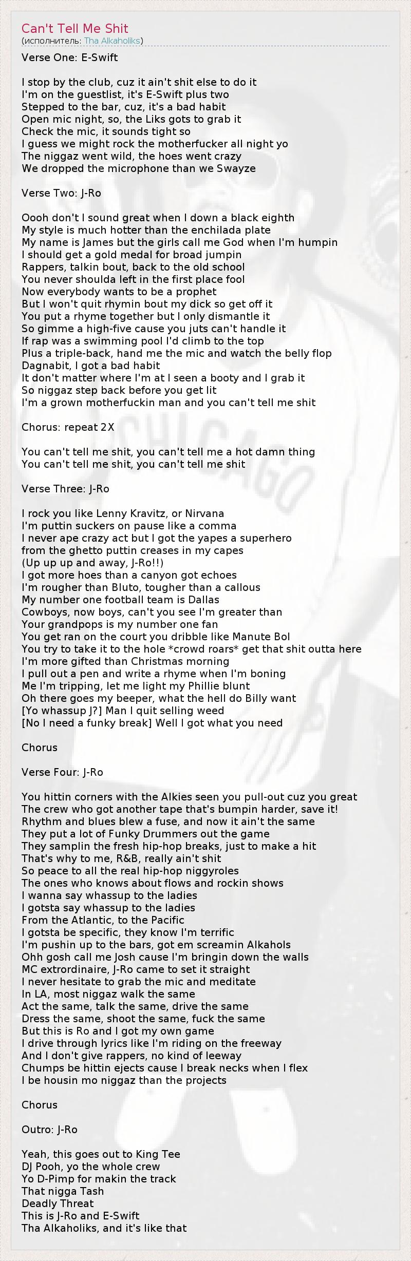 Verse One: E-Swift I stop by the club, cuz it ain't shit else to do it I'm on the guestlist, it's E-Swift plus two Stepped to the bar, cuz, it's a bad habit Open mic night, so, the Liks gots to grab it Check the mic, it sounds tight so I guess we might rock the motherfucker all night yo The niggaz went wild, the hoes went crazy We dropped the microphone than we Swayze Verse Two: J-Ro Oooh don't I sound great when I down a black eighth My style is much hotter than the enchilada plate My name is James but the girls call me God when I'm humpin I should get a gold medal for broad jumpin Rappers, talkin bout, back to the old school You never shoulda left in the first place fool Now everybody wants to be a prophet But I won't quit rhymin bout my dick so get off it You put a rhyme together but I only dismantle it So gimme a high-five cause you juts can't handle it If rap was a swimming pool I'd climb to the top Plus a triple-back, hand me the mic and watch the belly flop Dagnabit, I got a bad habit It don't matter where I'm at I seen a booty and I grab it So niggaz step back before you get lit I'm a grown motherfuckin man and you can't tell me shit Chorus: repeat 2X You can't tell me shit, you can't tell me a hot damn thing You can't tell me shit, you can't tell me shit Verse Three: J-Ro I rock you like Lenny Kravitz, or Nirvana I'm puttin suckers on pause like a comma I never ape crazy act but I got the yapes a superhero from the ghetto puttin creases in my capes (Up up up and away, J-Ro!!) I got more hoes than a canyon got echoes I'm rougher than Bluto, tougher than a callous My number one football team is Dallas Cowboys, now boys, can't you see I'm greater than Your grandpops is my number one fan You get ran on the court you dribble like Manute Bol You try to take it to the hole *crowd roars* get that shit outta here I'm more gifted than Christmas morning I pull out a pen and write a rhyme when I'm boning Me I'm tripping, let me light my Phillie blunt Oh there goes my beeper, what the hell do Billy want [Yo whassup J?] Man I quit selling weed [No I need a funky break] Well I got what you need Chorus Verse Four: J-Ro You hittin corners with the Alkies seen you pull-out cuz you great The crew who got another tape that's bumpin harder, save it! Rhythm and blues blew a fuse, and now it ain't the same They put a lot of Funky Drummers out the game They samplin the fresh hip-hop breaks, just to make a hit That's why to me, R&B, really ain't shit So peace to all the real hip-hop niggyroles The ones who knows about flows and rockin shows I wanna say whassup to the ladies I gotsta say whassup to the ladies From the Atlantic, to the Pacific I gotsta be specific, they know I'm terrific I'm pushin up to the bars, got em screamin Alkahols Ohh gosh call me Josh cause I'm bringin down the walls MC extrordinaire, J-Ro came to set it straight I never hesitate to grab the mic and meditate In LA, most niggaz walk the same Act the same, talk the same, drive the same Dress the same, shoot the same, fuck the same But this is Ro and I got my own game I drive through lyrics like I'm riding on the freeway And I don't give rappers, no kind of leeway Chumps be hittin ejects cause I break necks when I flex I be housin mo niggaz than the projects Chorus Outro: J-Ro Yeah, this goes out to King Tee DJ Pooh, yo the whole crew Yo D-Pimp for makin the track That nigga Tash Deadly Threat This is J-Ro and E-Swift Tha Alkaholiks, and it's like that