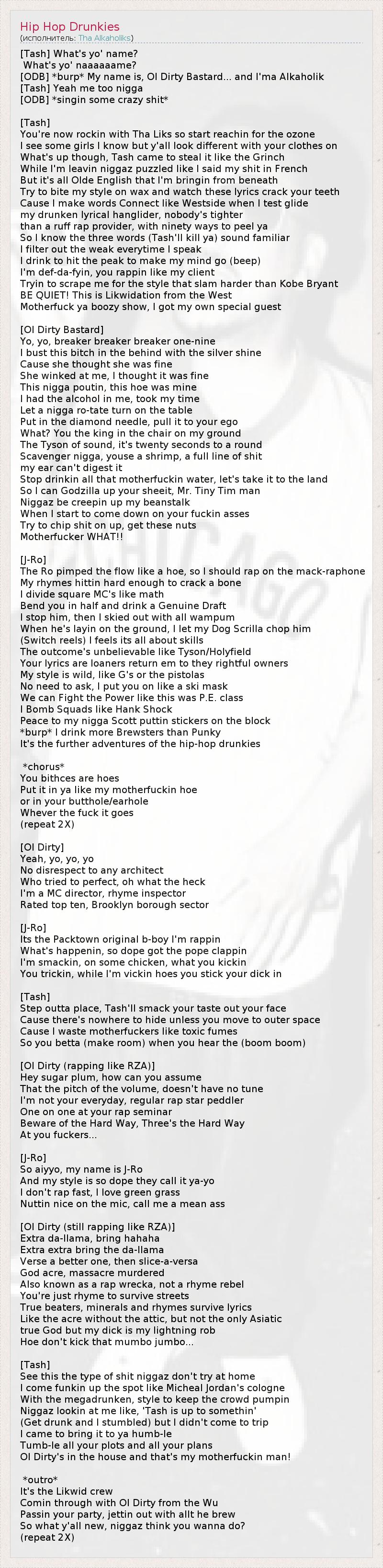 [Tash] What's yo' name? What's yo' naaaaaame? [ODB] *burp* My name is, Ol Dirty Bastard... and I'ma Alkaholik [Tash] Yeah me too nigga [ODB] *singin some crazy shit* [Tash] You're now rockin with Tha Liks so start reachin for the ozone I see some girls I know but y'all look different with your clothes on What's up though, Tash came to steal it like the Grinch While I'm leavin niggaz puzzled like I said my shit in French But it's all Olde English that I'm bringin from beneath Try to bite my style on wax and watch these lyrics crack your teeth Cause I make words Connect like Westside when I test glide my drunken lyrical hanglider, nobody's tighter than a ruff rap provider, with ninety ways to peel ya So I know the three words (Tash'll kill ya) sound familiar I filter out the weak everytime I speak I drink to hit the peak to make my mind go (beep) I'm def-da-fyin, you rappin like my client Tryin to scrape me for the style that slam harder than Kobe Bryant BE QUIET! This is Likwidation from the West Motherfuck ya boozy show, I got my own special guest [Ol Dirty Bastard] Yo, yo, breaker breaker breaker one-nine I bust this bitch in the behind with the silver shine Cause she thought she was fine She winked at me, I thought it was fine This nigga poutin, this hoe was mine I had the alcohol in me, took my time Let a nigga ro-tate turn on the table Put in the diamond needle, pull it to your ego What? You the king in the chair on my ground The Tyson of sound, it's twenty seconds to a round Scavenger nigga, youse a shrimp, a full line of shit my ear can't digest it Stop drinkin all that motherfuckin water, let's take it to the land So I can Godzilla up your sheeit, Mr. Tiny Tim man Niggaz be creepin up my beanstalk When I start to come down on your fuckin asses Try to chip shit on up, get these nuts Motherfucker WHAT!! [J-Ro] The Ro pimped the flow like a hoe, so I should rap on the mack-raphone My rhymes hittin hard enough to crack a bone I divide square MC's like math Bend you in half and drink a Genuine Draft I stop him, then I skied out with all wampum When he's layin on the ground, I let my Dog Scrilla chop him (Switch reels) I feels its all about skills The outcome's unbelievable like Tyson/Holyfield Your lyrics are loaners return em to they rightful owners My style is wild, like G's or the pistolas No need to ask, I put you on like a ski mask We can Fight the Power like this was P.E. class I Bomb Squads like Hank Shock Peace to my nigga Scott puttin stickers on the block *burp* I drink more Brewsters than Punky It's the further adventures of the hip-hop drunkies *chorus* You bithces are hoes Put it in ya like my motherfuckin hoe or in your butthole/earhole Whever the fuck it goes (repeat 2X) [Ol Dirty] Yeah, yo, yo, yo No disrespect to any architect Who tried to perfect, oh what the heck I'm a MC director, rhyme inspector Rated top ten, Brooklyn borough sector [J-Ro] Its the Packtown original b-boy I'm rappin What's happenin, so dope got the pope clappin I'm smackin, on some chicken, what you kickin You trickin, while I'm vickin hoes you stick your dick in [Tash] Step outta place, Tash'll smack your taste out your face Cause there's nowhere to hide unless you move to outer space Cause I waste motherfuckers like toxic fumes So you betta (make room) when you hear the (boom boom) [Ol Dirty (rapping like RZA)] Hey sugar plum, how can you assume That the pitch of the volume, doesn't have no tune I'm not your everyday, regular rap star peddler One on one at your rap seminar Beware of the Hard Way, Three's the Hard Way At you fuckers... [J-Ro] So aiyyo, my name is J-Ro And my style is so dope they call it ya-yo I don't rap fast, I love green grass Nuttin nice on the mic, call me a mean ass [Ol Dirty (still rapping like RZA)] Extra da-llama, bring hahaha Extra extra bring the da-llama Verse a better one, then slice-a-versa God acre, massacre murdered Also known as a rap wrecka, not a rhyme rebel You're just rhyme to survive streets True beaters, minerals and rhymes survive lyrics Like the acre without the attic, but not the only Asiatic true God but my dick is my lightning rob Hoe don't kick that mumbo jumbo... [Tash] See this the type of shit niggaz don't try at home I come funkin up the spot like Micheal Jordan's cologne With the megadrunken, style to keep the crowd pumpin Niggaz lookin at me like, 'Tash is up to somethin' (Get drunk and I stumbled) but I didn't come to trip I came to bring it to ya humb-le Tumb-le all your plots and all your plans Ol Dirty's in the house and that's my motherfuckin man! *outro* It's the Likwid crew Comin through with Ol Dirty from the Wu Passin your party, jettin out with allt he brew So what y'all new, niggaz think you wanna do? (repeat 2X)