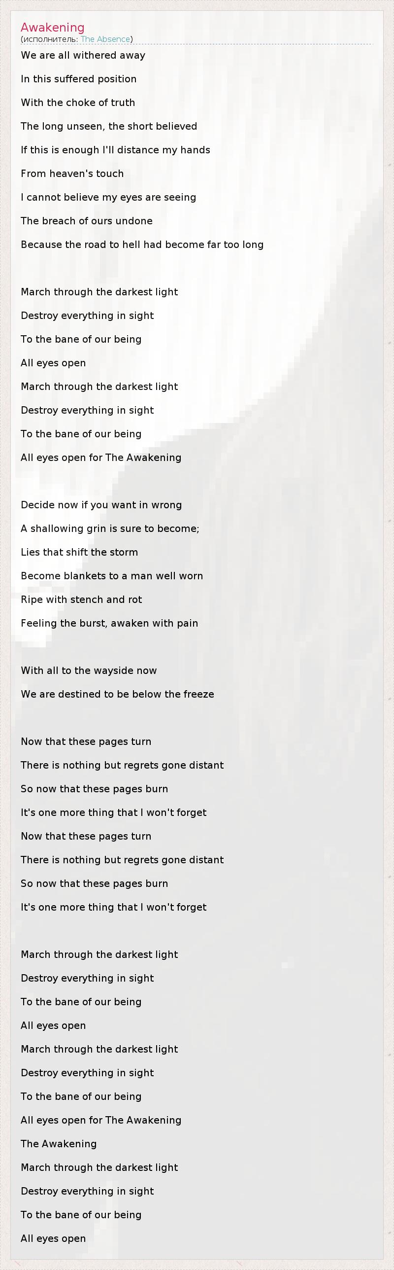 We are all withered away In this suffered position With the choke of truth The long unseen, the short believed If this is enough I'll distance my hands From heaven's touch I cannot believe my eyes are seeing The breach of ours undone Because the road to hell had become far too long March through the darkest light Destroy everything in sight To the bane of our being All eyes open March through the darkest light Destroy everything in sight To the bane of our being All eyes open for The Awakening Decide now if you want in wrong A shallowing grin is sure to become; Lies that shift the storm Become blankets to a man well worn Ripe with stench and rot Feeling the burst, awaken with pain With all to the wayside now We are destined to be below the freeze Now that these pages turn There is nothing but regrets gone distant So now that these pages burn It's one more thing that I won't forget Now that these pages turn There is nothing but regrets gone distant So now that these pages burn It's one more thing that I won't forget March through the darkest light Destroy everything in sight To the bane of our being All eyes open March through the darkest light Destroy everything in sight To the bane of our being All eyes open for The Awakening The Awakening March through the darkest light Destroy everything in sight To the bane of our being All eyes open