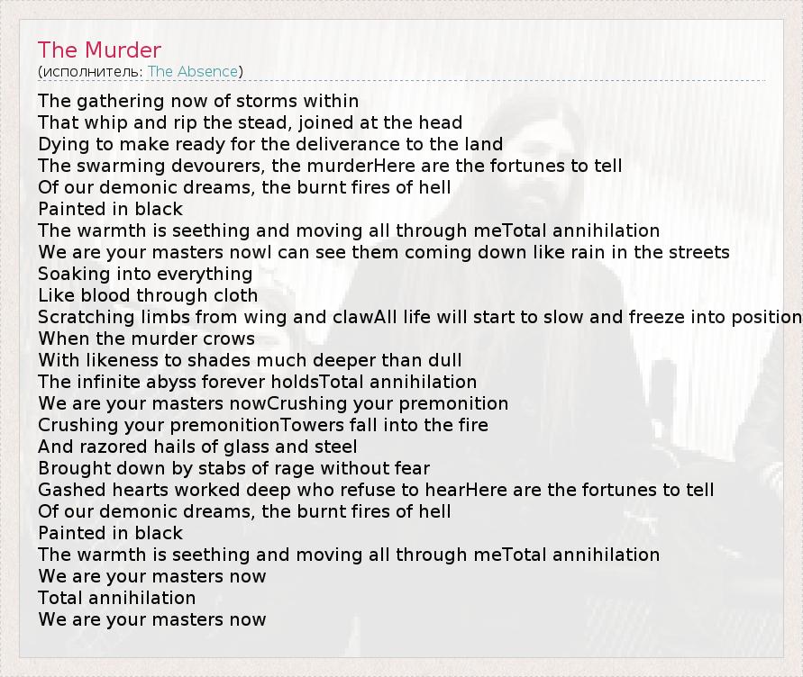 Это интересно:Новое приобретение лейбла “Metal Blade Records“, флоридская группа The Absence, записала 3 альбома. Коллектив играет музыку в стиле "Melodic Death-Metal".Дискография:2005 - From Your Grave2007 - Riders Of The Plague2010 - Enemy UnboundСостав :Джейми Стюарт - Вокал Патрик Пинтаволл - Гитара Питер Джозеф - Гитара Николас Калаки - Бас Джерими Клинк - Ударные