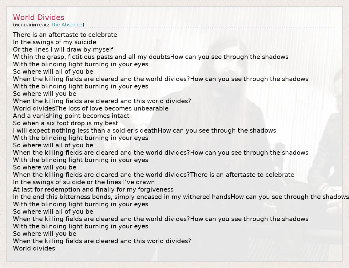 There is an aftertaste to celebrate In the swings of my suicide Or the lines I will draw by myself Within the grasp, fictitious pasts and all my doubtsHow can you see through the shadows With the blinding light burning in your eyes So where will all of you be When the killing fields are cleared and the world divides?How can you see through the shadows With the blinding light burning in your eyes So where will you be When the killing fields are cleared and this world divides? World dividesThe loss of love becomes unbearable And a vanishing point becomes intact So when a six foot drop is my best I will expect nothing less than a soldier's deathHow can you see through the shadows With the blinding light burning in your eyes So where will all of you be When the killing fields are cleared and the world divides?How can you see through the shadows With the blinding light burning in your eyes So where will you be When the killing fields are cleared and the world divides?There is an aftertaste to celebrate In the swings of suicide or the lines I've drawn At last for redemption and finally for my forgiveness In the end this bitterness bends, simply encased in my withered handsHow can you see through the shadows With the blinding light burning in your eyes So where will all of you be When the killing fields are cleared and the world divides?How can you see through the shadows With the blinding light burning in your eyes So where will you be When the killing fields are cleared and this world divides? World divides