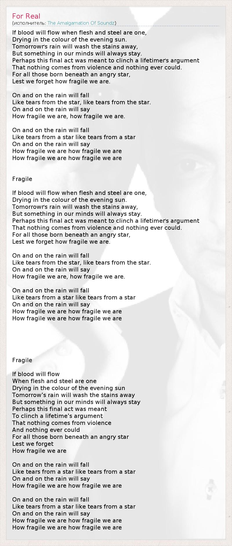 If blood will flow when flesh and steel are one, Drying in the colour of the evening sun. Tomorrowґs rain will wash the stains away, But something in our minds will always stay. Perhaps this final act was meant to clinch a lifetimeґs argument That nothing comes from violence and nothing ever could. For all those born beneath an angry star, Lest we forget how fragile we are. On and on the rain will fall Like tears from the star, like tears from the star. On and on the rain will say How fragile we are, how fragile we are. On and on the rain will fall Like tears from a star like tears from a star On and on the rain will say How fragile we are how fragile we are How fragile we are how fragile we are Fragile If blood will flow when flesh and steel are one, Drying in the colour of the evening sun. Tomorrowґs rain will wash the stains away, But something in our minds will always stay. Perhaps this final act was meant to clinch a lifetimeґs argument That nothing comes from violence and nothing ever could. For all those born beneath an angry star, Lest we forget how fragile we are. On and on the rain will fall Like tears from the star, like tears from the star. On and on the rain will say How fragile we are, how fragile we are. On and on the rain will fall Like tears from a star like tears from a star On and on the rain will say How fragile we are how fragile we are How fragile we are how fragile we are Fragile If blood will flow When flesh and steel are one Drying in the colour of the evening sun Tomorrow's rain will wash the stains away But something in our minds will always stay Perhaps this final act was meant To clinch a lifetime's argument That nothing comes from violence And nothing ever could For all those born beneath an angry star Lest we forget How fragile we are On and on the rain will fall Like tears from a star like tears from a star On and on the rain will say How fragile we are how fragile we are On and on the rain will fall Like tears from a star like tears from a star On and on the rain will say How fragile we are how fragile we are How fragile we are how fragile we are