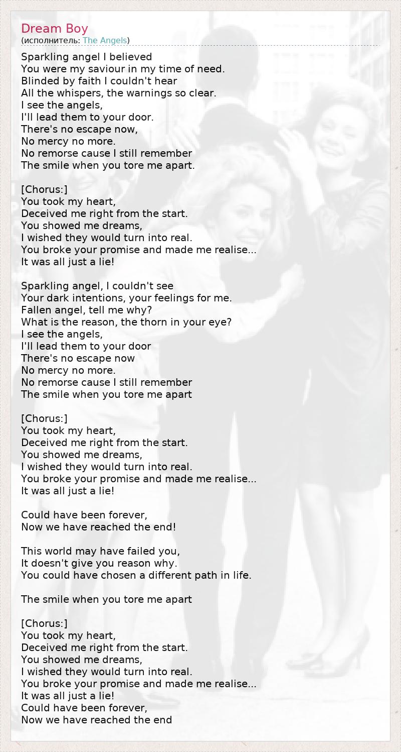 Сияющий ангел! Я верила – Ты мой спаситель в самый черный час. Ослепленная верой, я не могла услышать Тихий шепот, так ясно предупреждающий меня. Я вижу ангелов И веду их к твоим дверям. Теперь – нет спасения И нет больше жалости, Нет раскаяния – я по-прежнему помню Улыбку, с которой ты убил меня. [Припев:] Ты забрал мое сердце, С самого начала все было ложью. Ты показал мне мечту – Я так хотела сделать ее реальностью. Ты нарушил обещание и открыл мне глаза На весь твой обман. Сияющий ангел! Я не могла увидеть Твоей темной силы, твоих чувств ко мне. Падший ангел! Скажи, почему? Какова причина, пелена на твоих глазах? Я вижу ангелов И веду их к твоим дверям. Теперь – нет спасения И нет больше жалости, Нет раскаяния – я по-прежнему помню Улыбку, с которой ты убил меня. [Припев:] Ты забрал мое сердце, С самого начала все было ложью. Ты показал мне мечту – Я так хотела сделать ее реальностью. Ты нарушил обещание и открыл мне глаза На весь твой обман. Это могло длиться вечно, Но мы сами положили всему конец! Возможно, этот мир обманул твои надежды, Но это не оправдание – Ты мог бы выбрать иной путь в этой жизни. Улыбка, с которой ты убил меня... [Припев:] Ты забрал мое сердце, С самого начала все было ложью. Ты показал мне мечту – Я так хотела сделать ее реальностью. Ты нарушил все обещания и открыл мне глаза На весь твой обман. Это могло длиться вечно, Но мы сами положили всему конец!