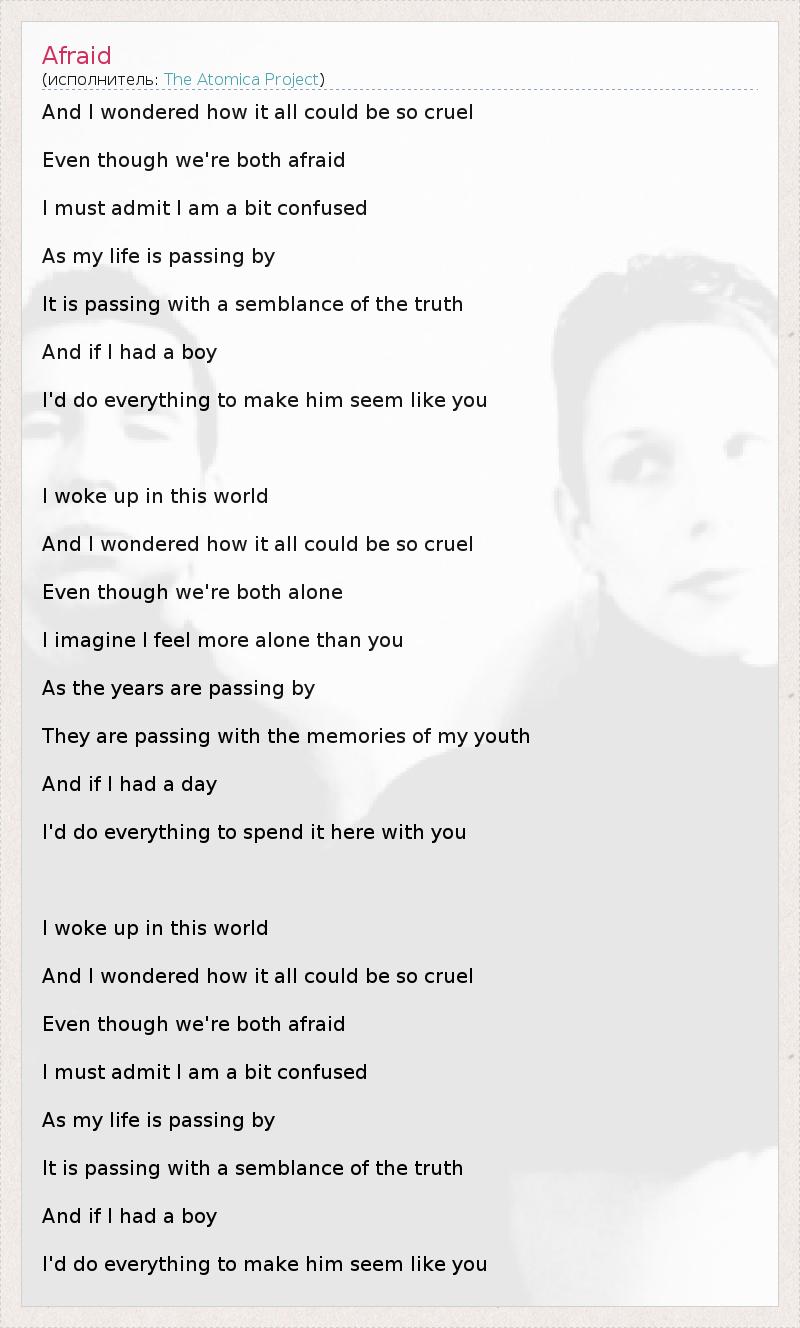 And I wondered how it all could be so cruel Even though we're both afraid I must admit I am a bit confused As my life is passing by It is passing with a semblance of the truth And if I had a boy I'd do everything to make him seem like you I woke up in this world And I wondered how it all could be so cruel Even though we're both alone I imagine I feel more alone than you As the years are passing by They are passing with the memories of my youth And if I had a day I'd do everything to spend it here with you I woke up in this world And I wondered how it all could be so cruel Even though we're both afraid I must admit I am a bit confused As my life is passing by It is passing with a semblance of the truth And if I had a boy I'd do everything to make him seem like you