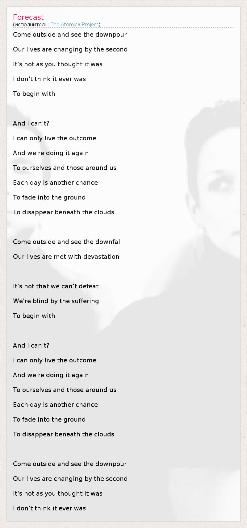 Come outside and see the downpour Our lives are changing by the second It's not as you thought it was I don't think it ever was To begin with And I can't? I can only live the outcome And we're doing it again To ourselves and those around us Each day is another chance To fade into the ground To disappear beneath the clouds Come outside and see the downfall Our lives are met with devastation It's not that we can't defeat We're blind by the suffering To begin with And I can't? I can only live the outcome And we're doing it again To ourselves and those around us Each day is another chance To fade into the ground To disappear beneath the clouds Come outside and see the downpour Our lives are changing by the second It's not as you thought it was I don't think it ever was