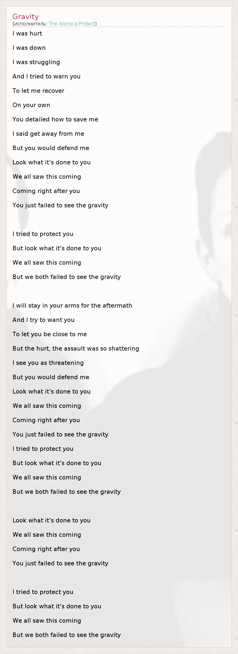 I was hurt I was down I was struggling And I tried to warn you To let me recover On your own You detailed how to save me I said get away from me But you would defend me Look what it's done to you We all saw this coming Coming right after you You just failed to see the gravity I tried to protect you But look what it's done to you We all saw this coming But we both failed to see the gravity I will stay in your arms for the aftermath And I try to want you To let you be close to me But the hurt, the assault was so shattering I see you as threatening But you would defend me Look what it's done to you We all saw this coming Coming right after you You just failed to see the gravity I tried to protect you But look what it's done to you We all saw this coming But we both failed to see the gravity Look what it's done to you We all saw this coming Coming right after you You just failed to see the gravity I tried to protect you But look what it's done to you We all saw this coming But we both failed to see the gravity