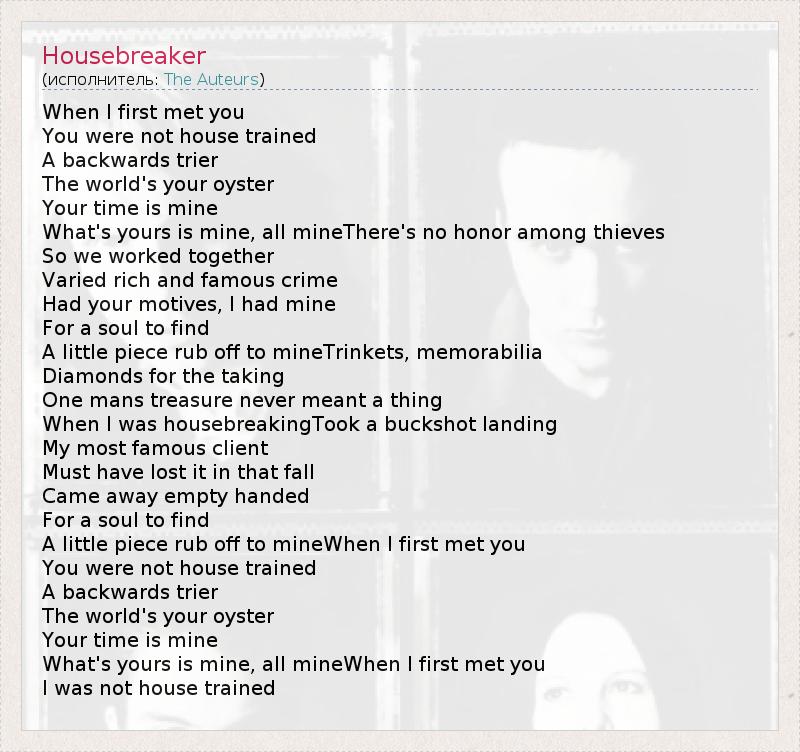 When I first met you You were not house trained A backwards trier The world's your oyster Your time is mine What's yours is mine, all mineThere's no honor among thieves So we worked together Varied rich and famous crime Had your motives, I had mine For a soul to find A little piece rub off to mineTrinkets, memorabilia Diamonds for the taking One mans treasure never meant a thing When I was housebreakingTook a buckshot landing My most famous client Must have lost it in that fall Came away empty handed For a soul to find A little piece rub off to mineWhen I first met you You were not house trained A backwards trier The world's your oyster Your time is mine What's yours is mine, all mineWhen I first met you I was not house trained