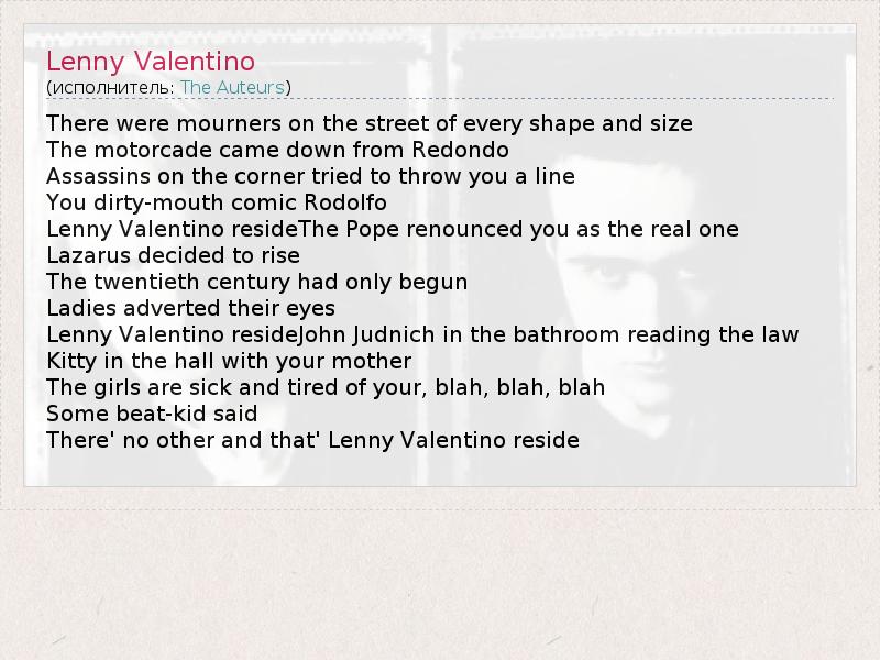 There were mourners on the street of every shape and size The motorcade came down from Redondo Assassins on the corner tried to throw you a line You dirty-mouth comic Rodolfo Lenny Valentino resideThe Pope renounced you as the real one Lazarus decided to rise The twentieth century had only begun Ladies adverted their eyes Lenny Valentino resideJohn Judnich in the bathroom reading the law Kitty in the hall with your mother The girls are sick and tired of your, blah, blah, blah Some beat-kid said There' no other and that' Lenny Valentino reside