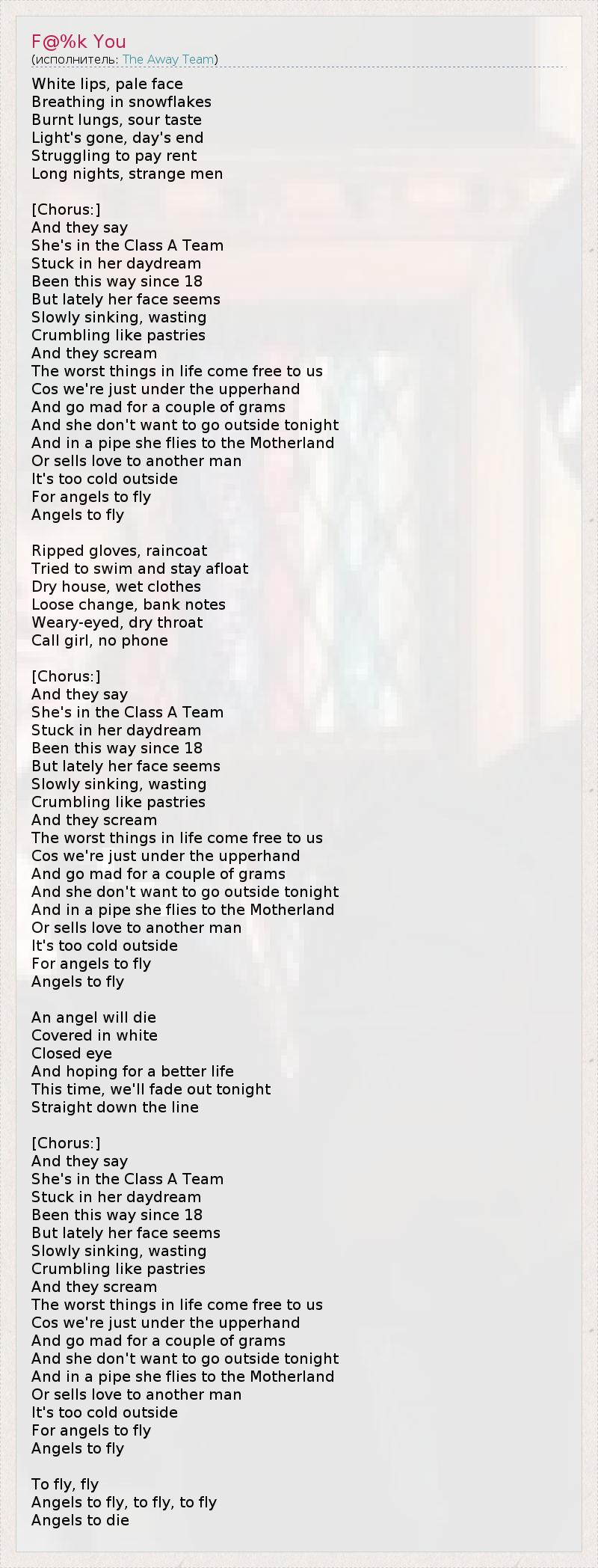 Белые губы, бледное лицо, Вдыхает снежные хлопья, Сожженные легкие, кислый вкус. Стало темно, кончился день, Борется, чтобы платить за квартиру, Долгие ночи, незнакомые люди... [Припев:] Говорят, Что она в Команде Класса А, 1 Застряла в своих грезах, Делает это с 18 лет. Но в последнее время ее лицо кажется Медленно тонущим, изнуренным, Крошащимся, как пирожные. Они кричат. Худшее, что может случиться в жизни, достается нам бесплатно, Потому что мы все под чьим-то влиянием И сходим с ума, чтобы достать пару граммов. Она не хочет выходить из дома сегодня вечером. И на трубке 2 она полетит на родину Или продаст любовь другому мужчине. А на улице так холодно Для полетов ангелов, Полетов ангелов... Рваные перчатки, дождевик, Попыталась плыть и остаться на плаву. Сухой дом, влажная одежда. Мелкие деньги, банкноты, Усталые глаза, сухое горло. Девушка по вызову, без телефона. [Припев:] Говорят, Что она в Команде Класса А, Застряла в своих грезах, Делает это с 18 лет. Но в последнее время ее лицо кажется Медленно тонущим, изнуренным, Крошащимся, как пирожные. Они кричат. Худшее, что может случиться в жизни, достается нам бесплатно, Потому что мы все под чьим-то влиянием И сходим с ума, чтобы достать пару граммов. Она не хочет выходить из дома сегодня вечером. И на трубке она полетит на родину Или продаст любовь другому мужчине. А на улице так холодно Для полетов ангелов, Полетов ангелов... Ангел умрет, Одетый в белое, С закрытыми глазами, Надеясь на лучшую жизнь. В этот раз мы постепенно уйдем этим вечером, Раз и на всегда. [Припев:] Говорят, Что она в Команде Класса А, Застряла в своих грезах, Делает это с 18 лет. Но в последнее время ее лицо кажется Медленно тонущим, изнуренным, Крошащимся, как пирожные. Они кричат. Худшее, что может случиться в жизни, достается нам бесплатно, Потому что мы все под чьим-то влиянием И сходим с ума, чтобы достать пару граммов. Она не хочет выходить из дома сегодня вечером. И на трубке она полетит на родину Или продаст любовь другому мужчине. А на улице так холодно Для полетов ангелов, Полетов ангелов... Для полетов, полетов, Для полетов ангелов... Для гибели ангелов... 1 - класс А – одна из трех групп наркотических средств по классификации в Великобритании. К нему относятся ЛСД, экстази, героин, метадон, кокаин и др. Речь о том, что героиня песни употребляет героин 2 - трубка для затяжки героином
