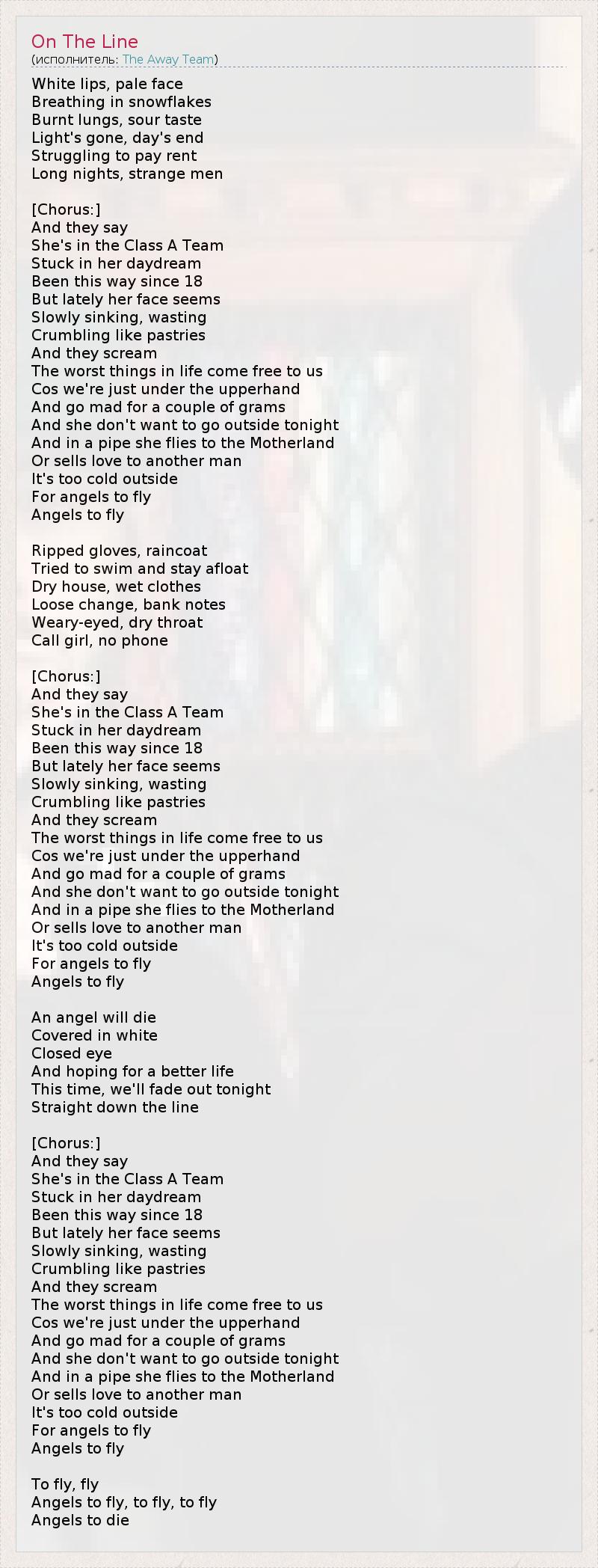 1 - класс А – одна из трех групп наркотических средств по классификации в Великобритании. К нему относятся ЛСД, экстази, героин, метадон, кокаин и др. Речь о том, что героиня песни употребляет героин