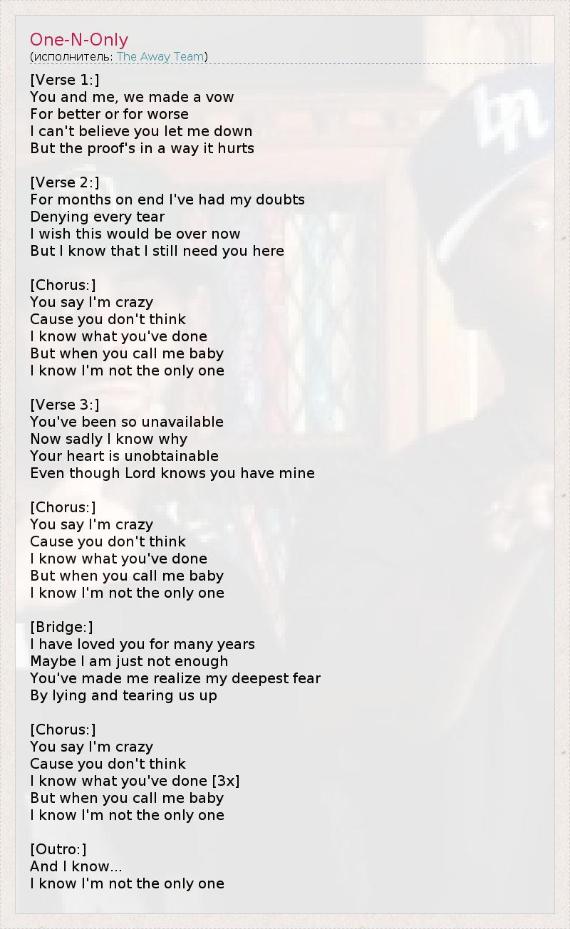 [1 куплет:] Мы поклялись друг другу в верности, Что бы ни случилось. Не могу поверить, что ты подвела меня. Но доказательства таковы, что мне больно. [2 куплет:] Несколько месяцев я сомневался, Не позволяя себе плакать. Я так хочу, чтобы это закончилось, Но я знаю, что ты всё ещё нужна мне. [Припев:] Ты говоришь, что я сумасшедший, Потому что ты думаешь, Что я не знаю, что ты сделала. Но когда ты зовешь меня "малыш", Я знаю, что я у тебя не единственный. [3 куплет:] Ты была такой отстраненной. Теперь я с горечью понимаю, почему. Твое сердце недоступно, Но ведь Бог знает, что моё – у тебя. [Припев:] Ты говоришь, что я сумасшедший, Потому что ты думаешь, Что я не знаю, что ты сделала. Но когда ты зовешь меня "малыш", Я знаю, что я у тебя не единственный. [Переход:] Я любил тебя столько лет. Может быть, тебе меня мало? Из-за того, что ты лгала и разлучила нас, Мой самый глубокий страх стал реальностью. [Припев:] Ты говоришь, что я сумасшедший, Потому что ты думаешь, Что я не знаю, что ты сделала. [3x] Но когда ты зовешь меня "малыш", Я знаю, что я у тебя не единственный. [Окончание:] И я знаю... Я знаю, что я у тебя не единственный.