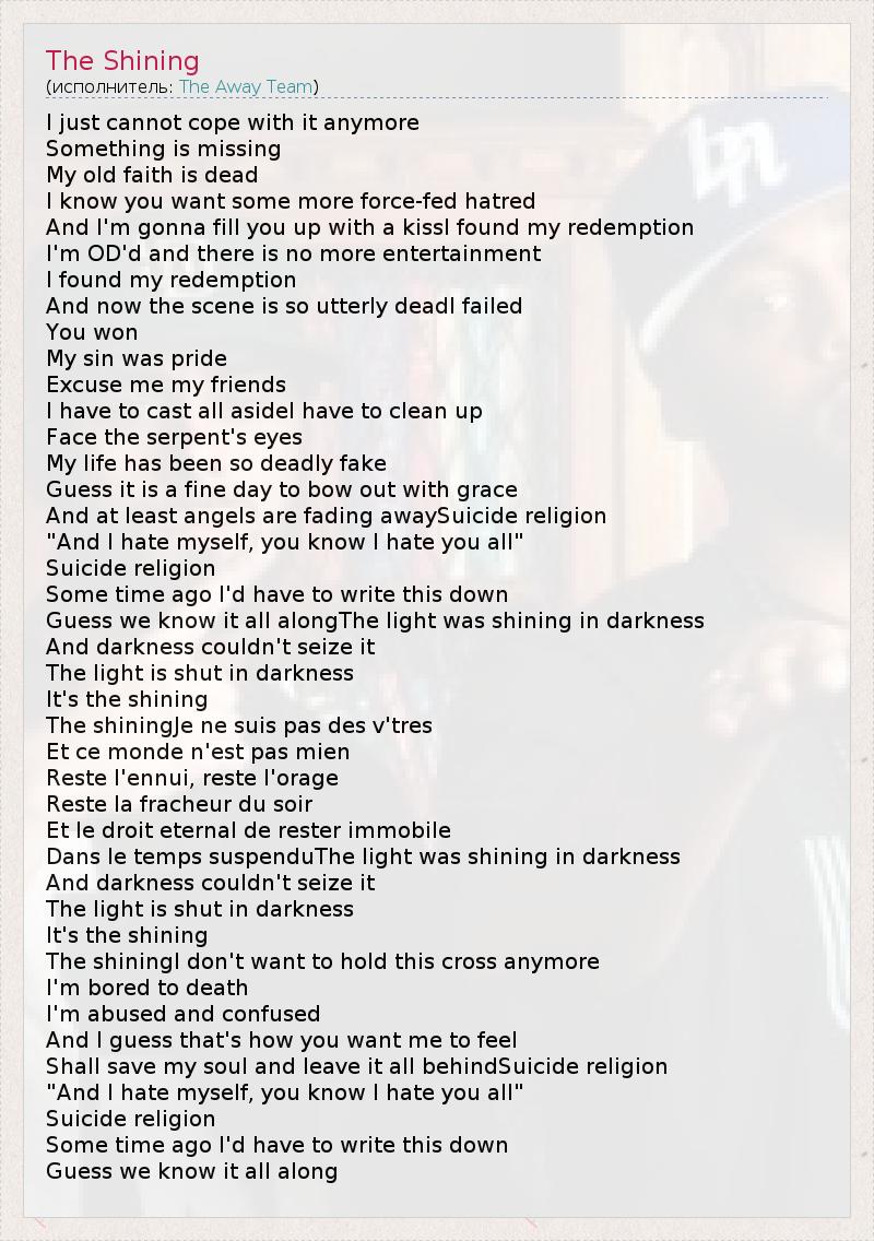 I just cannot cope with it anymore Something is missing My old faith is dead I know you want some more force-fed hatred And I'm gonna fill you up with a kissI found my redemption I'm OD'd and there is no more entertainment I found my redemption And now the scene is so utterly deadI failed You won My sin was pride Excuse me my friends I have to cast all asideI have to clean up Face the serpent's eyes My life has been so deadly fake Guess it is a fine day to bow out with grace And at least angels are fading awaySuicide religion "And I hate myself, you know I hate you all" Suicide religion Some time ago I'd have to write this down Guess we know it all alongThe light was shining in darkness And darkness couldn't seize it The light is shut in darkness It's the shining The shiningJe ne suis pas des v'tres Et ce monde n'est pas mien Reste l'ennui, reste l'orage Reste la fracheur du soir Et le droit eternal de rester immobile Dans le temps suspenduThe light was shining in darkness And darkness couldn't seize it The light is shut in darkness It's the shining The shiningI don't want to hold this cross anymore I'm bored to death I'm abused and confused And I guess that's how you want me to feel Shall save my soul and leave it all behindSuicide religion "And I hate myself, you know I hate you all" Suicide religion Some time ago I'd have to write this down Guess we know it all along