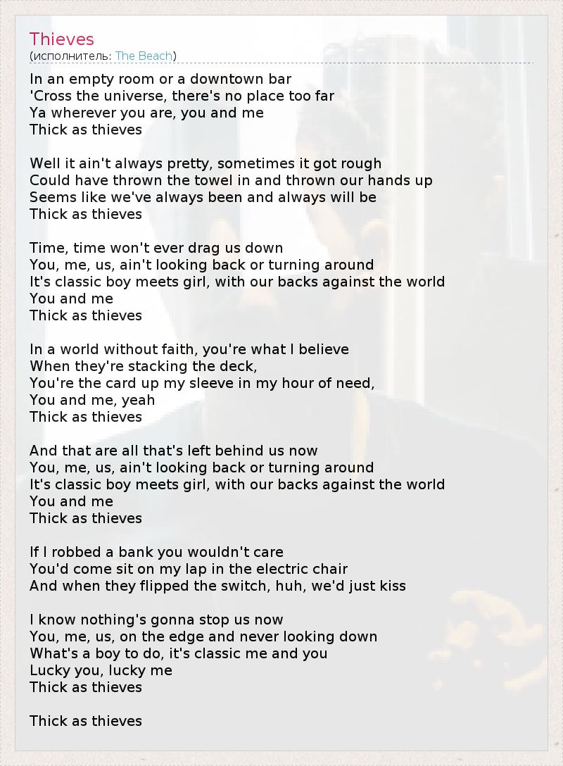 * В песне обыгрывается устойчивое словосочетание "Thick as thieves", имеющее значение "Не разлей вода", "Неразлучные", "Закадычные друзья" и т.д., буквально же читающееся как "Близкие, как воры"