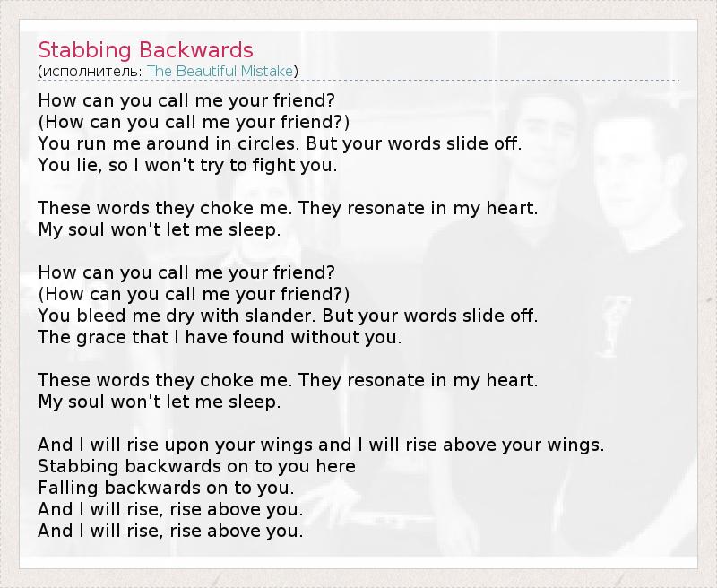 How can you call me your friend? (How can you call me your friend?) You run me around in circles. But your words slide off. You lie, so I won't try to fight you. These words they choke me. They resonate in my heart. My soul won't let me sleep. How can you call me your friend? (How can you call me your friend?) You bleed me dry with slander. But your words slide off. The grace that I have found without you. These words they choke me. They resonate in my heart. My soul won't let me sleep. And I will rise upon your wings and I will rise above your wings. Stabbing backwards on to you here Falling backwards on to you. And I will rise, rise above you. And I will rise, rise above you.