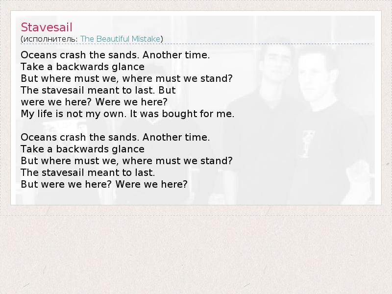 Это интересно:The Beautiful Mistake, группа из Сан Диего, Калифорния, основана в 2000м году, выпущенно 2 альбома дебютный - "Light A Match, For I Deserve To Burn" в 2002м, 2ой - "This Is Who You Are" в 2004м.дискографияDecember EP The Beautiful Mistake (EP) Light a Match, For I Deserve to Burn This Is Who You Are The Beautiful Mistake & Ettison Clio (Split EP) оффициальный сайт - thebeautifulmistake.commyspace - myspace.com/thebeautifulmistake