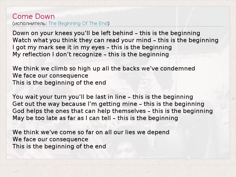Поставленный на колени, ты будешь оставлен позади – это начало. Обрати внимание на то, что ты думаешь, ибо твои намерения можно разгадать – это начало. Я получил свою отметину, узри ее в моих глазах – это начало. Я не узнаю свое отражение – это начало. Мы думаем, что стоим намного выше тех, кого мы осудили Мы сталкиваемся лицом к лицу с последствиями - Это начало конца Ты ждешь своей очереди, ты последний – это начало. Уходи с дороги, так как это мое место – это начало. Бог помогает тем, кто может помочь себе сам – это начало. Может, слишком поздно, насколько я могу сказать – это начало. Мы думаем, что добились многого, мы зависимы от собственной лжи. Мы сталкиваемся лицом к лицу с последствиями - Это начало конца...