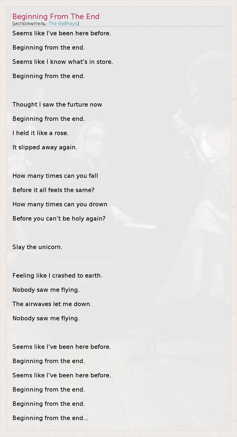 Seems like I've been here before. Beginning from the end. Seems like I know what's in store. Beginning from the end. Thought I saw the furture now Beginning from the end. I held it like a rose. It slipped away again. How many times can you fall Before it all feels the same? How many times can you drown Before you can't be holy again? Slay the unicorn. Feeling like I crashed to earth. Nobody saw me flying. The airwaves let me down. Nobody saw me flying. Seems like I've been here before. Beginning from the end. Seems like I've been here before. Beginning from the end. Beginning from the end. Beginning from the end...