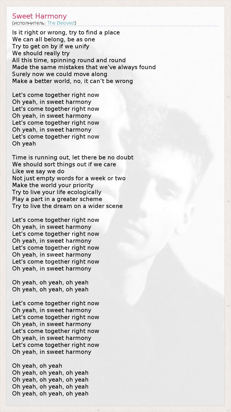Is it right or wrong, try to find a place We can all belong, be as one Try to get on by if we unify We should really try All this time, spinning round and round Made the same mistakes that we've always found Surely now we could move along Make a better world, no, it can't be wrong Let's come together right now Oh yeah, in sweet harmony Let's come together right now Oh yeah, in sweet harmony Let's come together right now Oh yeah, in sweet harmony Let's come together right now Oh yeah Time is running out, let there be no doubt We should sort things out if we care Like we say we do Not just empty words for a week or two Make the world your priority Try to live your life ecologically Play a part in a greater scheme Try to live the dream on a wider scene Let's come together right now Oh yeah, in sweet harmony Let's come together right now Oh yeah, in sweet harmony Let's come together right now Oh yeah, in sweet harmony Let's come together right now Oh yeah, in sweet harmony Oh yeah, oh yeah, oh yeah Oh yeah, oh yeah, oh yeah Let's come together right now Oh yeah, in sweet harmony Let's come together right now Oh yeah, in sweet harmony Let's come together right now Oh yeah, in sweet harmony Let's come together right now Oh yeah, in sweet harmony Oh yeah, oh yeah Oh yeah, oh yeah, oh yeah Oh yeah, oh yeah, oh yeah Oh yeah, oh yeah, oh yeah Oh yeah, oh yeah, oh yeah