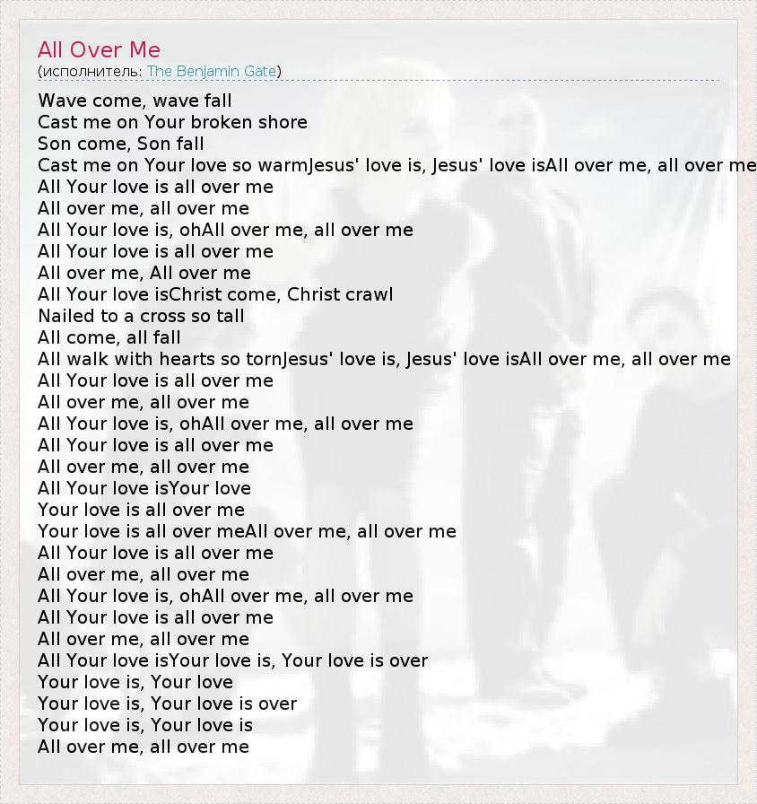 All walk with hearts so tornJesus' love is, Jesus' love isAll over me, all over me