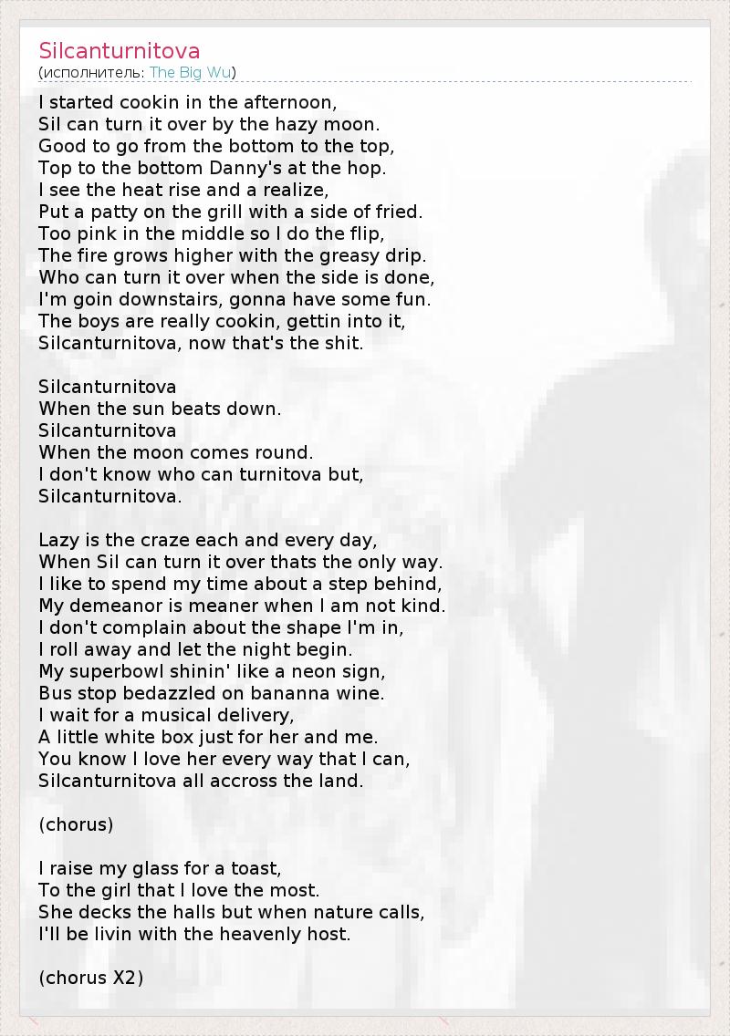 I started cookin in the afternoon, Sil can turn it over by the hazy moon. Good to go from the bottom to the top, Top to the bottom Danny's at the hop. I see the heat rise and a realize, Put a patty on the grill with a side of fried. Too pink in the middle so I do the flip, The fire grows higher with the greasy drip. Who can turn it over when the side is done, I'm goin downstairs, gonna have some fun. The boys are really cookin, gettin into it, Silcanturnitova, now that's the shit. Silcanturnitova When the sun beats down. Silcanturnitova When the moon comes round. I don't know who can turnitova but, Silcanturnitova. Lazy is the craze each and every day, When Sil can turn it over thats the only way. I like to spend my time about a step behind, My demeanor is meaner when I am not kind. I don't complain about the shape I'm in, I roll away and let the night begin. My superbowl shinin' like a neon sign, Bus stop bedazzled on bananna wine. I wait for a musical delivery, A little white box just for her and me. You know I love her every way that I can, Silcanturnitova all accross the land. (chorus) I raise my glass for a toast, To the girl that I love the most. She decks the halls but when nature calls, I'll be livin with the heavenly host. (chorus X2)