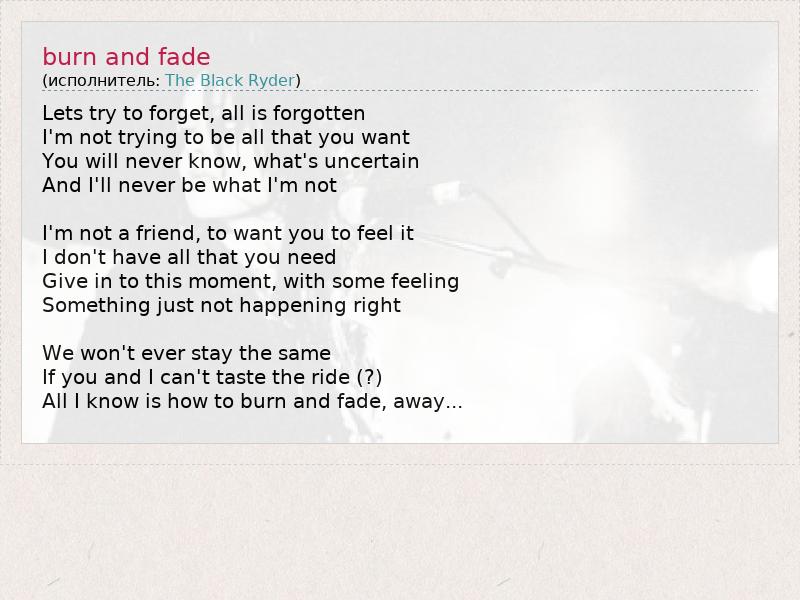 Это интересно:The Black Ryder являются альтернативной группой из Сиднея, Австралия. Их дебютный альбом Buy The Ticket, Take The Ride был выпущен 6 ноября 2009 года с The Anti-Machine Machine / EMI Music в Австралии, а также с Mexican Summer Records 21 сентября 2010 года.Группа была сформирована в 2007 году основателями Эйми Нэш (вокал, гитара, клавишные, перкуссия) и Скотт фон Ryper (вокал, гитара, бас, клавишные, перкуссия) после их выхода из The Morning After Girls.... продолжение
