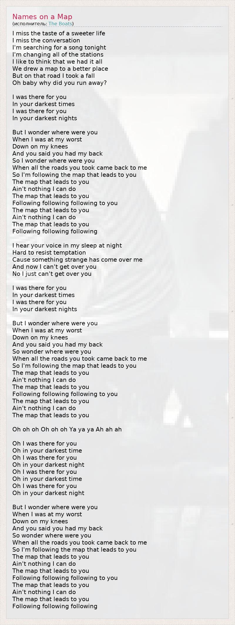 Мне не хватает той сладкой жизни, Я скучаю по разговорам. Этим вечером я ищу песню, Я переключаю все станции. Мне нравится думать, что у нас всё было, Мы нарисовали карту к лучшему месту. Но где-то на той дороге я упал. Детка, почему ты убежала? Я был с тобой В самые тяжёлые времена. Я был с тобой Самыми тёмными ночами. Но мне интересно, где же была ты, Когда мне было тяжело, Когда я был на коленях? А ведь ты говорила, что прикроешь меня. И интересно, где же ты была, Если шла по дорогам, которые вели только ко мне? Поэтому я иду по карте, которая ведёт к тебе, Карта, которая ведёт к тебе. Я ничего не могу поделать. Карта, которая ведёт к тебе. Иду, иду, иду к тебе, Карта, которая ведёт к тебе. Я ничего не могу поделать. Карта, которая ведёт к тебе, Иду, иду, иду... По ночам я слышу твой голос во сне, Трудно сопротивляться искушению. Потому что что-то странное на меня нашло, И теперь я не могу забыть тебя, Нет, я просто не могу забыть тебя. Я был с тобой В самые тяжёлые времена. Я был с тобой Самыми тёмными ночами. Но мне интересно, где же была ты, Когда мне было тяжело, Когда я был на коленях? А ведь ты говорила, что прикроешь меня. И интересно, где же ты была, Если шла по дорогам, которые вели только ко мне? Поэтому я иду по карте, которая ведёт к тебе, Карта, которая ведёт к тебе. Я ничего не могу поделать. Карта, которая ведёт к тебе. Иду, иду, иду к тебе, Карта, которая ведёт к тебе. Я ничего не могу поделать. Карта, которая ведёт к тебе. О-о-о... Я был с тобой В самые тяжёлые времена. Я был с тобой Самыми тёмными ночами. Я был с тобой В самые тяжёлые времена. Я был с тобой Самыми тёмными ночами. Но мне интересно, где же была ты, Когда мне было тяжело, Когда я был на коленях? А ведь ты говорила, что прикроешь меня. И интересно, где же ты была, Если шла по дорогам, которые вели только ко мне? Поэтому я иду по карте, которая ведёт к тебе, Карта, которая ведёт к тебе. Я ничего не могу поделать. Карта, которая ведёт к тебе. Иду, иду, иду к тебе, Карта, которая ведёт к тебе. Я ничего не могу поделать. Карта, которая ведёт к тебе, Иду, иду, иду...