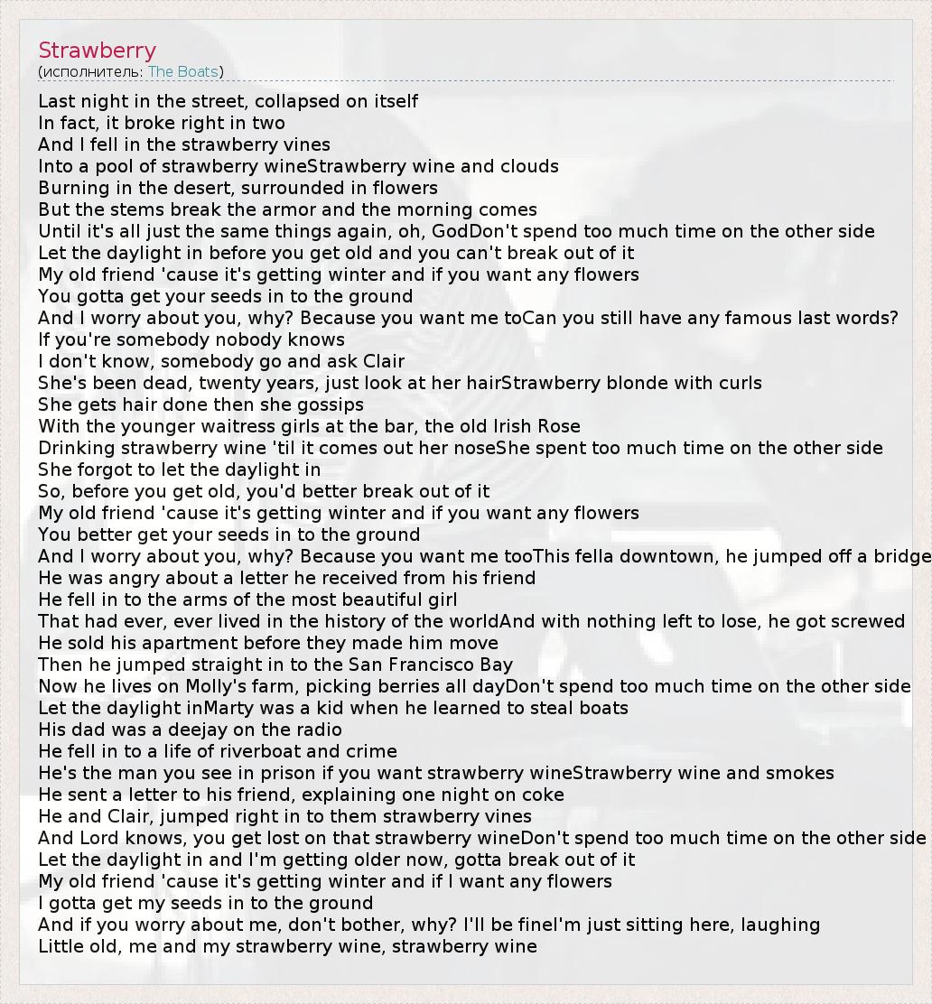 Last night in the street, collapsed on itself In fact, it broke right in two And I fell in the strawberry vines Into a pool of strawberry wineStrawberry wine and clouds Burning in the desert, surrounded in flowers But the stems break the armor and the morning comes Until it's all just the same things again, oh, GodDon't spend too much time on the other side Let the daylight in before you get old and you can't break out of it My old friend 'cause it's getting winter and if you want any flowers You gotta get your seeds in to the ground And I worry about you, why? Because you want me toCan you still have any famous last words? If you're somebody nobody knows I don't know, somebody go and ask Clair She's been dead, twenty years, just look at her hairStrawberry blonde with curls She gets hair done then she gossips With the younger waitress girls at the bar, the old Irish Rose Drinking strawberry wine 'til it comes out her noseShe spent too much time on the other side She forgot to let the daylight in So, before you get old, you'd better break out of it My old friend 'cause it's getting winter and if you want any flowers You better get your seeds in to the ground And I worry about you, why? Because you want me tooThis fella downtown, he jumped off a bridge He was angry about a letter he received from his friend He fell in to the arms of the most beautiful girl That had ever, ever lived in the history of the worldAnd with nothing left to lose, he got screwed He sold his apartment before they made him move Then he jumped straight in to the San Francisco Bay Now he lives on Molly's farm, picking berries all dayDon't spend too much time on the other side Let the daylight inMarty was a kid when he learned to steal boats His dad was a deejay on the radio He fell in to a life of riverboat and crime He's the man you see in prison if you want strawberry wineStrawberry wine and smokes He sent a letter to his friend, explaining one night on coke He and Clair, jumped right in to them strawberry vines And Lord knows, you get lost on that strawberry wineDon't spend too much time on the other side Let the daylight in and I'm getting older now, gotta break out of it My old friend 'cause it's getting winter and if I want any flowers I gotta get my seeds in to the ground And if you worry about me, don't bother, why? I'll be fineI'm just sitting here, laughing Little old, me and my strawberry wine, strawberry wine