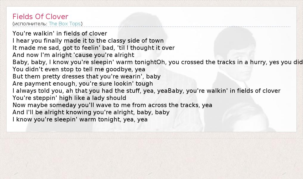 Это интересно:За свою недолгую карьеру "Box tops" заработали себе славу одной из лучших "белых" соул-групп, несмотря на то, что они были не столь плодовитыми, как, скажем, "Righteous Brothers" или "Rascals". История команды началась в Мемфисе (штат Теннеси), где под вывеской "The Devilles" собрались четверо школьных приятелей – Билл Каннингхэм (р. 23 января 1950), Джон Эванс (р. 18 июня 1948), Дэнни Смит (р. 25 августа... продолжение