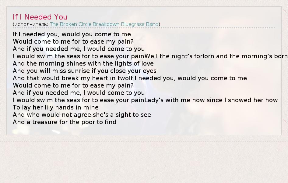 If I needed you, would you come to me Would come to me for to ease my pain? And if you needed me, I would come to you I would swim the seas for to ease your painWell the night's forlorn and the morning's born And the morning shines with the lights of love And you will miss sunrise if you close your eyes And that would break my heart in twoIf I needed you, would you come to me Would come to me for to ease my pain? And if you needed me, I would come to you I would swim the seas for to ease your painLady's with me now since I showed her how To lay her lily hands in mine And who would not agree she's a sight to see And a treasure for the poor to find