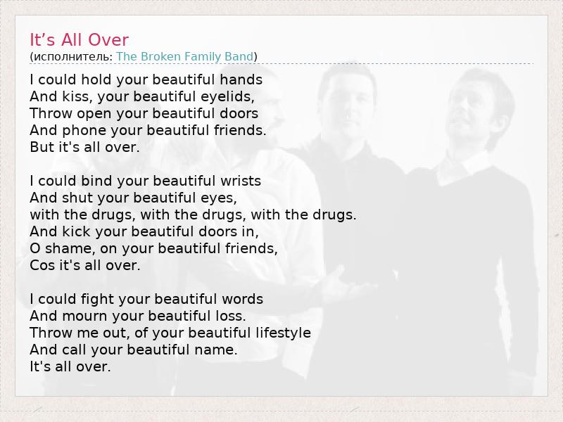 I could hold your beautiful hands And kiss, your beautiful eyelids, Throw open your beautiful doors And phone your beautiful friends. But it's all over. I could bind your beautiful wrists And shut your beautiful eyes, with the drugs, with the drugs, with the drugs. And kick your beautiful doors in, O shame, on your beautiful friends, Cos it's all over. I could fight your beautiful words And mourn your beautiful loss. Throw me out, of your beautiful lifestyle And call your beautiful name. It's all over.