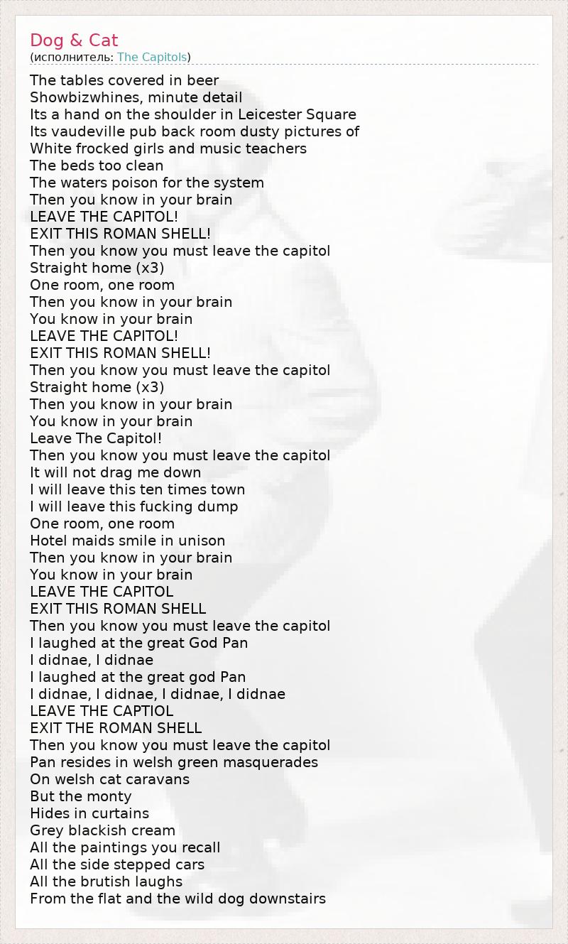 The tables covered in beer Showbizwhines, minute detail Its a hand on the shoulder in Leicester Square Its vaudeville pub back room dusty pictures of White frocked girls and music teachers The beds too clean The waters poison for the system Then you know in your brain LEAVE THE CAPITOL! EXIT THIS ROMAN SHELL! Then you know you must leave the capitol Straight home (x3) One room, one room Then you know in your brain You know in your brain LEAVE THE CAPITOL! EXIT THIS ROMAN SHELL! Then you know you must leave the capitol Straight home (x3) Then you know in your brain You know in your brain Leave The Capitol! Then you know you must leave the capitol It will not drag me down I will leave this ten times town I will leave this fucking dump One room, one room Hotel maids smile in unison Then you know in your brain You know in your brain LEAVE THE CAPITOL EXIT THIS ROMAN SHELL Then you know you must leave the capitol I laughed at the great God Pan I didnae, I didnae I laughed at the great god Pan I didnae, I didnae, I didnae, I didnae LEAVE THE CAPTIOL EXIT THE ROMAN SHELL Then you know you must leave the capitol Pan resides in welsh green masquerades On welsh cat caravans But the monty Hides in curtains Grey blackish cream All the paintings you recall All the side stepped cars All the brutish laughs From the flat and the wild dog downstairs