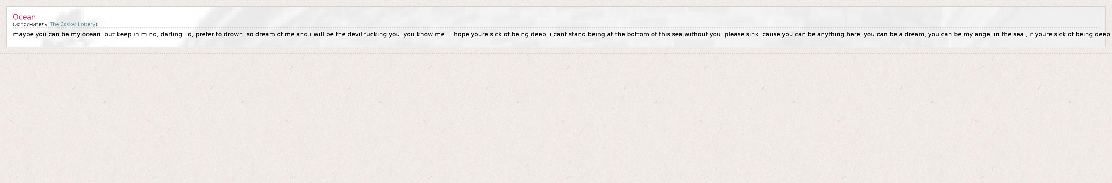maybe you can be my ocean. but keep in mind, darling i'd, prefer to drown. so dream of me and i will be the devil fucking you. you know me...i hope youre sick of being deep. i cant stand being at the bottom of this sea without you. please sink. cause you can be anything here. you can be a dream, you can be my angel in the sea., if youre sick of being deep.