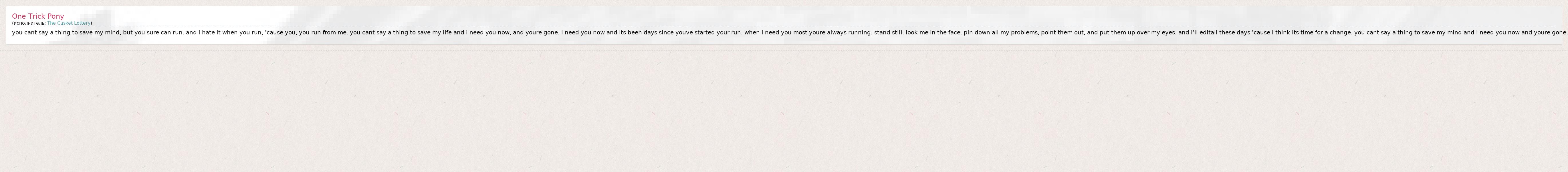 you cant say a thing to save my mind, but you sure can run. and i hate it when you run, 'cause you, you run from me. you cant say a thing to save my life and i need you now, and youre gone. i need you now and its been days since youve started your run. when i need you most youre always running. stand still. look me in the face. pin down all my problems, point them out, and put them up over my eyes. and i'll editall these days 'cause i think its time for a change. you cant say a thing to save my mind and i need you now and youre gone.