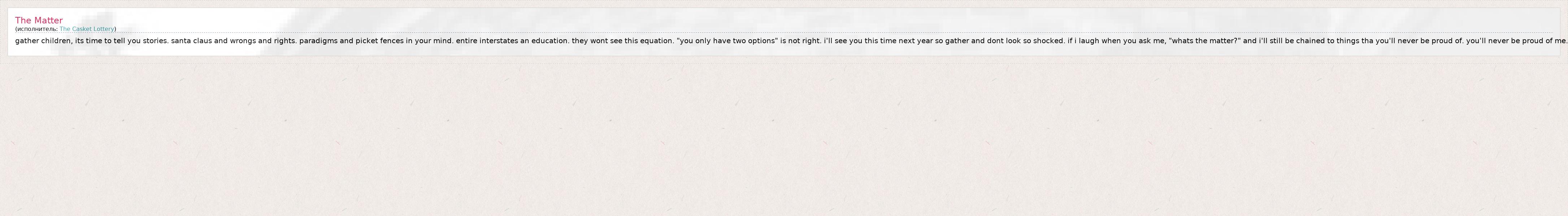 gather children, its time to tell you stories. santa claus and wrongs and rights. paradigms and picket fences in your mind. entire interstates an education. they wont see this equation. "you only have two options" is not right. i'll see you this time next year so gather and dont look so shocked. if i laugh when you ask me, "whats the matter?" and i'll still be chained to things tha you'll never be proud of. you'll never be proud of me.