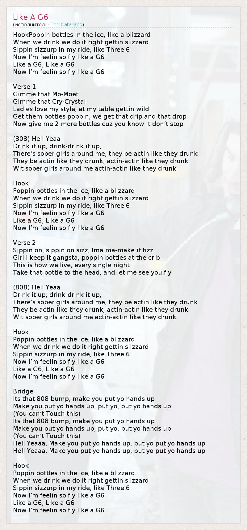 А как ты думаешь, о чем песня "Like A G6" ?