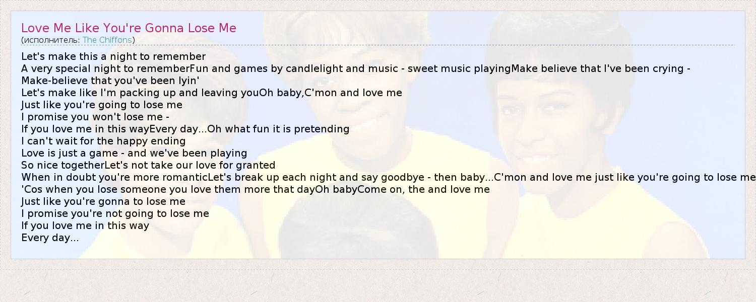ГлавнаяИсполнителиThe ChiffonsLove Me Like You're Gonna Lose Me