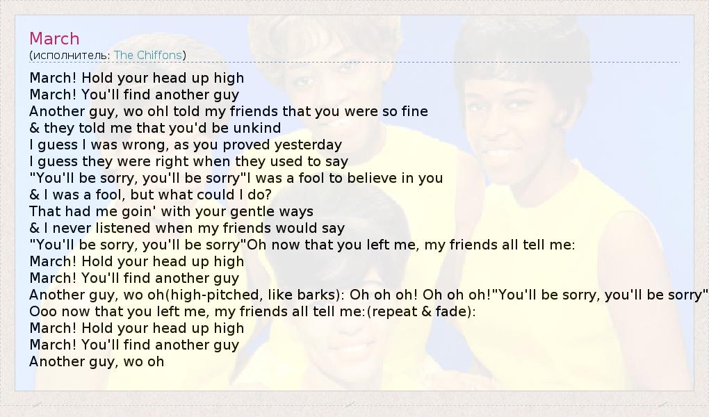 Это интересно:The Chiffons были одной из ведущих женских групп начала 1960-х годов. Такие хиты как "He's So Fine", и “One Fine Day” стали определяющими для музыки той эпохи.Группа, первоначально сформированное в Нью-Йорке 1960 г. как трио, включающее солисток Джуди Крэйг, Патрисию Беннетт и Барбару Ли, превратилось в квартет в 1962 г. (тогда к группе присоединилась еще одна участница Сильвия Петерсон, ранее певшая... продолжение