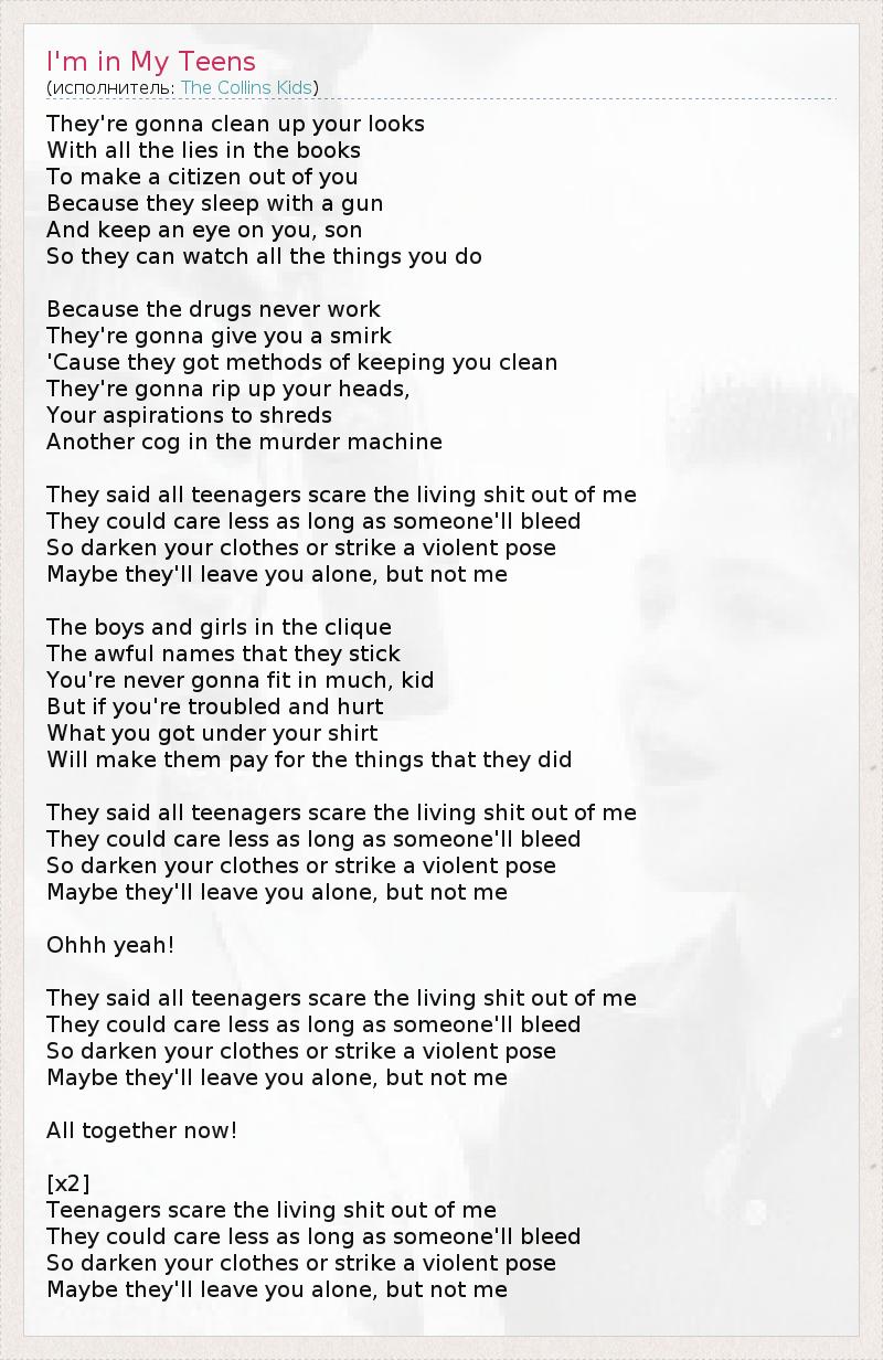 They're gonna clean up your looks With all the lies in the books To make a citizen out of you Because they sleep with a gun And keep an eye on you, son So they can watch all the things you do Because the drugs never work They're gonna give you a smirk 'Cause they got methods of keeping you clean They're gonna rip up your heads, Your aspirations to shreds Another cog in the murder machine They said all teenagers scare the living shit out of me They could care less as long as someone'll bleed So darken your clothes or strike a violent pose Maybe they'll leave you alone, but not me The boys and girls in the clique The awful names that they stick You're never gonna fit in much, kid But if you're troubled and hurt What you got under your shirt Will make them pay for the things that they did They said all teenagers scare the living shit out of me They could care less as long as someone'll bleed So darken your clothes or strike a violent pose Maybe they'll leave you alone, but not me Ohhh yeah! They said all teenagers scare the living shit out of me They could care less as long as someone'll bleed So darken your clothes or strike a violent pose Maybe they'll leave you alone, but not me All together now! [x2] Teenagers scare the living shit out of me They could care less as long as someone'll bleed So darken your clothes or strike a violent pose Maybe they'll leave you alone, but not me