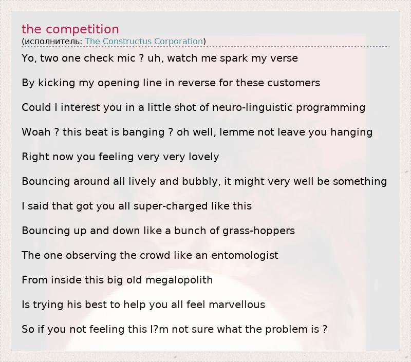 Yo, two one check mic ? uh, watch me spark my verse By kicking my opening line in reverse for these customers Could I interest you in a little shot of neuro-linguistic programming Woah ? this beat is banging ? oh well, lemme not leave you hanging Right now you feeling very very lovely Bouncing around all lively and bubbly, it might very well be something I said that got you all super-charged like this Bouncing up and down like a bunch of grass-hoppers The one observing the crowd like an entomologist From inside this big old megalopolith Is trying his best to help you all feel marvellous So if you not feeling this I?m not sure what the problem is ?