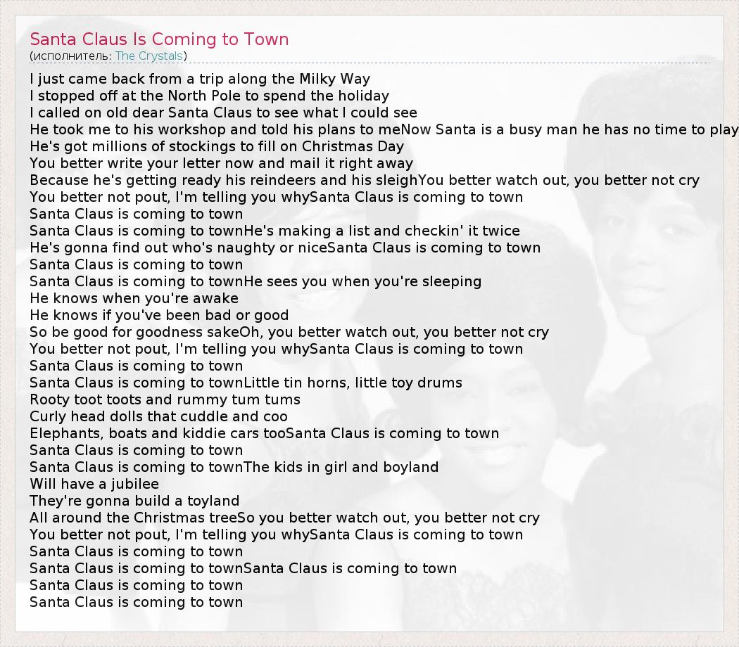 I just came back from a trip along the Milky Way I stopped off at the North Pole to spend the holiday I called on old dear Santa Claus to see what I could see He took me to his workshop and told his plans to meNow Santa is a busy man he has no time to play He's got millions of stockings to fill on Christmas Day You better write your letter now and mail it right away Because he's getting ready his reindeers and his sleighYou better watch out, you better not cry You better not pout, I'm telling you whySanta Claus is coming to town Santa Claus is coming to town Santa Claus is coming to townHe's making a list and checkin' it twice He's gonna find out who's naughty or niceSanta Claus is coming to town Santa Claus is coming to town Santa Claus is coming to townHe sees you when you're sleeping He knows when you're awake He knows if you've been bad or good So be good for goodness sakeOh, you better watch out, you better not cry You better not pout, I'm telling you whySanta Claus is coming to town Santa Claus is coming to town Santa Claus is coming to townLittle tin horns, little toy drums Rooty toot toots and rummy tum tums Curly head dolls that cuddle and coo Elephants, boats and kiddie cars tooSanta Claus is coming to town Santa Claus is coming to town Santa Claus is coming to townThe kids in girl and boyland Will have a jubilee They're gonna build a toyland All around the Christmas treeSo you better watch out, you better not cry You better not pout, I'm telling you whySanta Claus is coming to town Santa Claus is coming to town Santa Claus is coming to townSanta Claus is coming to town Santa Claus is coming to town Santa Claus is coming to town