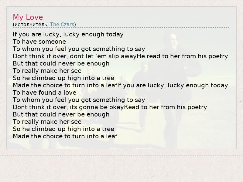 If you are lucky, lucky enough today To have someone To whom you feel you got something to say Dont think it over, dont let 'em slip awayHe read to her from his poetry But that could never be enough To really make her see So he climbed up high into a tree Made the choice to turn into a leafIf you are lucky, lucky enough today To have found a love To whom you feel you got something to say Dont think it over, its gonna be okayRead to her from his poetry But that could never be enough To really make her see So he climbed up high into a tree Made the choice to turn into a leaf