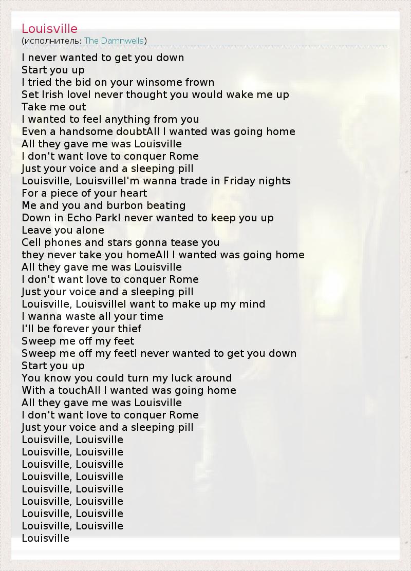 I never wanted to get you down Start you up I tried the bid on your winsome frown Set Irish loveI never thought you would wake me up Take me out I wanted to feel anything from you Even a handsome doubtAll I wanted was going home All they gave me was Louisville I don't want love to conquer Rome Just your voice and a sleeping pill Louisville, LouisvilleI'm wanna trade in Friday nights For a piece of your heart Me and you and burbon beating Down in Echo ParkI never wanted to keep you up Leave you alone Cell phones and stars gonna tease you they never take you homeAll I wanted was going home All they gave me was Louisville I don't want love to conquer Rome Just your voice and a sleeping pill Louisville, LouisvilleI want to make up my mind I wanna waste all your time I'll be forever your thief Sweep me off my feet Sweep me off my feetI never wanted to get you down Start you up You know you could turn my luck around With a touchAll I wanted was going home All they gave me was Louisville I don't want love to conquer Rome Just your voice and a sleeping pill Louisville, Louisville Louisville, Louisville Louisville, Louisville Louisville, Louisville Louisville, Louisville Louisville, Louisville Louisville, Louisville Louisville, Louisville Louisville