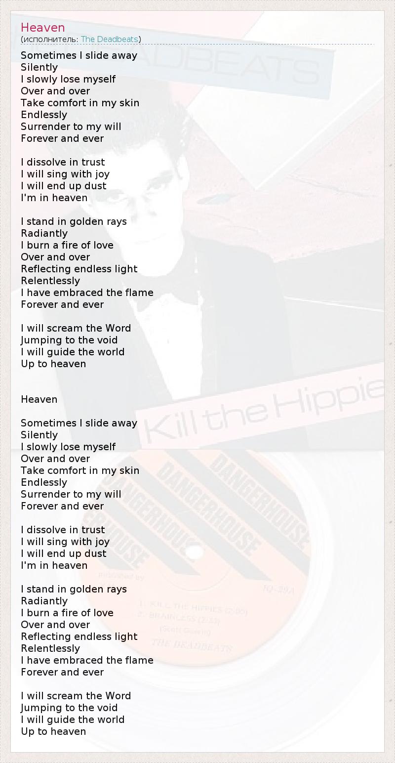 Sometimes I slide away Silently I slowly lose myself Over and over Take comfort in my skin Endlessly Surrender to my will Forever and ever I dissolve in trust I will sing with joy I will end up dust I'm in heaven I stand in golden rays Radiantly I burn a fire of love Over and over Reflecting endless light Relentlessly I have embraced the flame Forever and ever I will scream the Word Jumping to the void I will guide the world Up to heaven Heaven Sometimes I slide away Silently I slowly lose myself Over and over Take comfort in my skin Endlessly Surrender to my will Forever and ever I dissolve in trust I will sing with joy I will end up dust I'm in heaven I stand in golden rays Radiantly I burn a fire of love Over and over Reflecting endless light Relentlessly I have embraced the flame Forever and ever I will scream the Word Jumping to the void I will guide the world Up to heaven