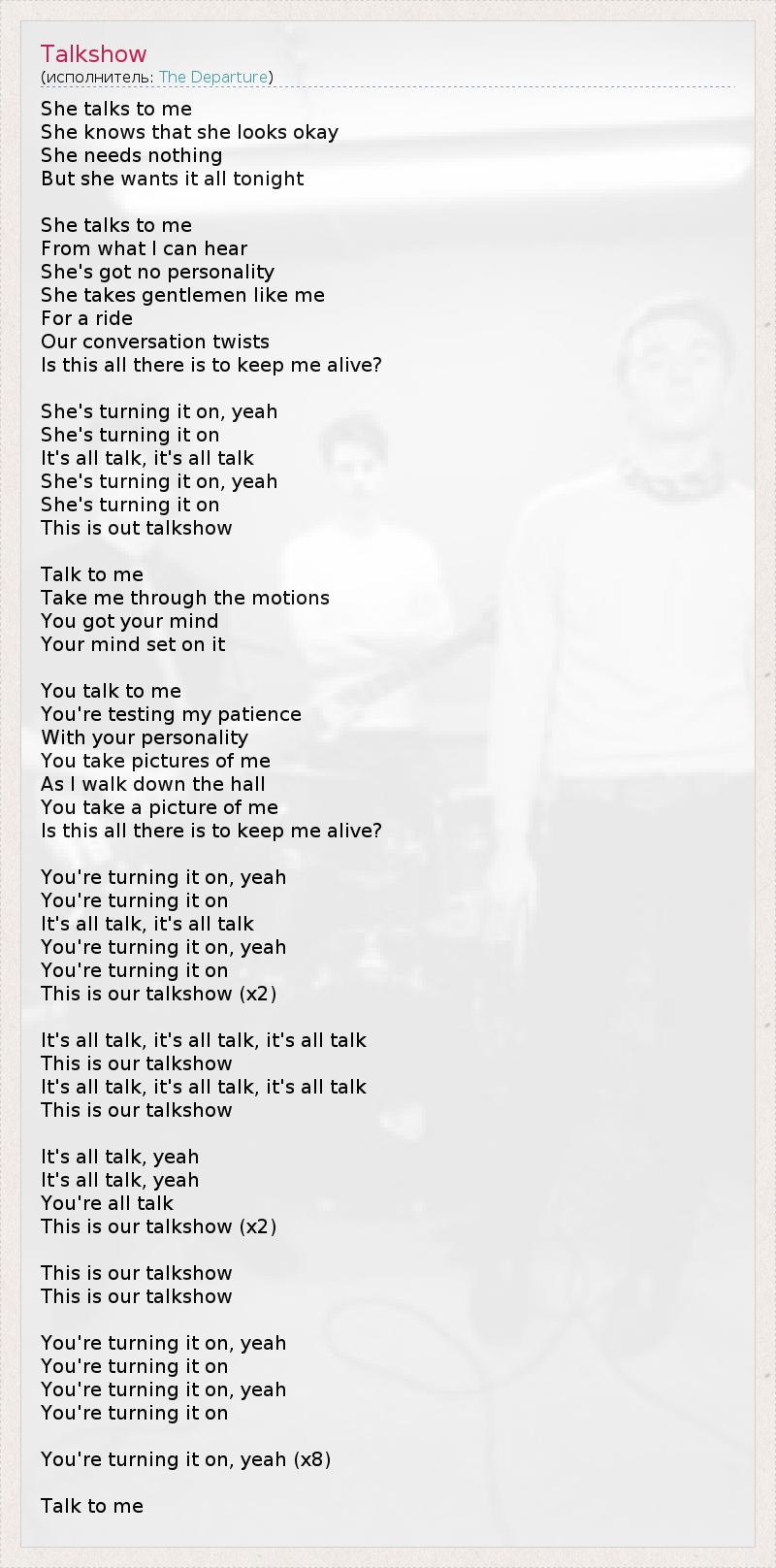 She talks to me She knows that she looks okay She needs nothing But she wants it all tonight She talks to me From what I can hear She's got no personality She takes gentlemen like me For a ride Our conversation twists Is this all there is to keep me alive? She's turning it on, yeah She's turning it on It's all talk, it's all talk She's turning it on, yeah She's turning it on This is out talkshow Talk to me Take me through the motions You got your mind Your mind set on it You talk to me You're testing my patience With your personality You take pictures of me As I walk down the hall You take a picture of me Is this all there is to keep me alive? You're turning it on, yeah You're turning it on It's all talk, it's all talk You're turning it on, yeah You're turning it on This is our talkshow (x2) It's all talk, it's all talk, it's all talk This is our talkshow It's all talk, it's all talk, it's all talk This is our talkshow It's all talk, yeah It's all talk, yeah You're all talk This is our talkshow (x2) This is our talkshow This is our talkshow You're turning it on, yeah You're turning it on You're turning it on, yeah You're turning it on You're turning it on, yeah (x8) Talk to me