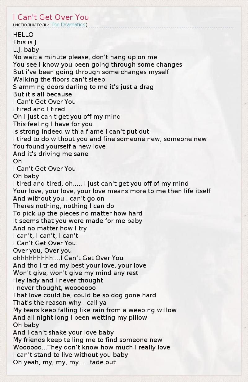 HELLO This is J L.J. baby No wait a minute please, don't hang up on me You see I know you been going through some changes But i've been going through some changes myself Walking the floors can't sleep Slamming doors darling to me it's just a drag But it's all because I Can't Get Over You I tired and I tired Oh I just can't get you off my mind This feeling I have for you Is strong indeed with a flame I can't put out I tired to do without you and fine someone new, someone new You found yourself a new love And it's driving me sane Oh I Can't Get Over You Oh baby I tired and tired, oh..... I just can't get you off of my mind Your love, your love, your love means more to me then life itself And without you I can't go on Theres nothing, nothing I can do To pick up the pieces no matter how hard It seems that you were made for me baby And no matter how I try I can't, I can't, I can't I Can't Get Over You Over you, Over you ohhhhhhhhh....I Can't Get Over You And tho I tried my best your love, your love Won't give, won't give my mind any rest Hey lady and I never thought I never thought, wooooooo That love could be, could be so dog gone hard That's the reason why I call ya My tears keep falling like rain from a weeping willow And all night long I been wetting my pillow Oh baby And I can't shake your love baby My friends keep telling me to find someone new Woooooo...They don't know how much I really love I can't stand to live without you baby Oh yeah, my, my, my......fade out